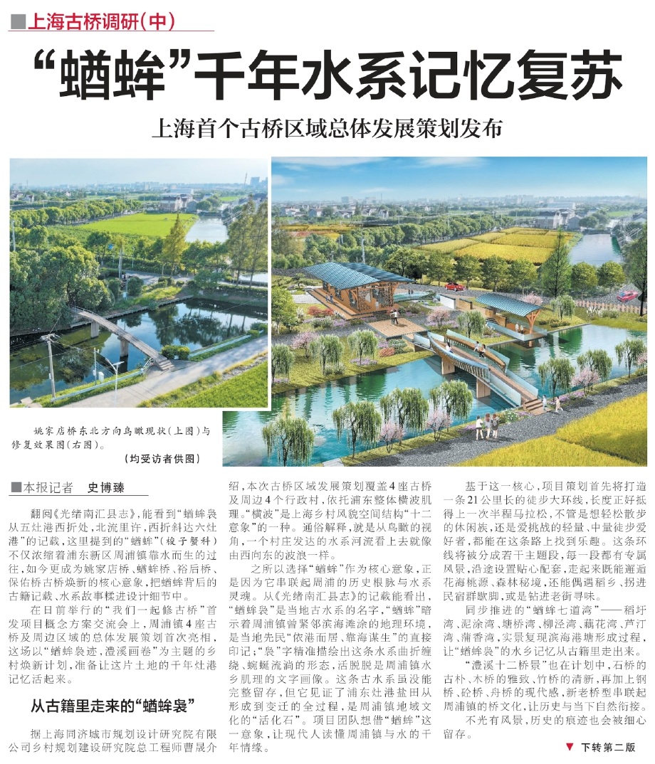 翻閱《光緒南匯縣志》,能看到“蝤蛑裊從五灶港西折處,北流里許,西折斜達六灶港”的記載,這里提到的“蝤蛑”(梭子蟹科)不僅濃縮著浦東新區(qū)周浦鎮(zhèn)靠水而生的過往,如今更成為姚家店橋、蝤蛑橋、裕后橋、保佑橋古橋煥新的核心意象,把蝤蛑背后的古籍記載、水系故事糅進設計細節(jié)中。