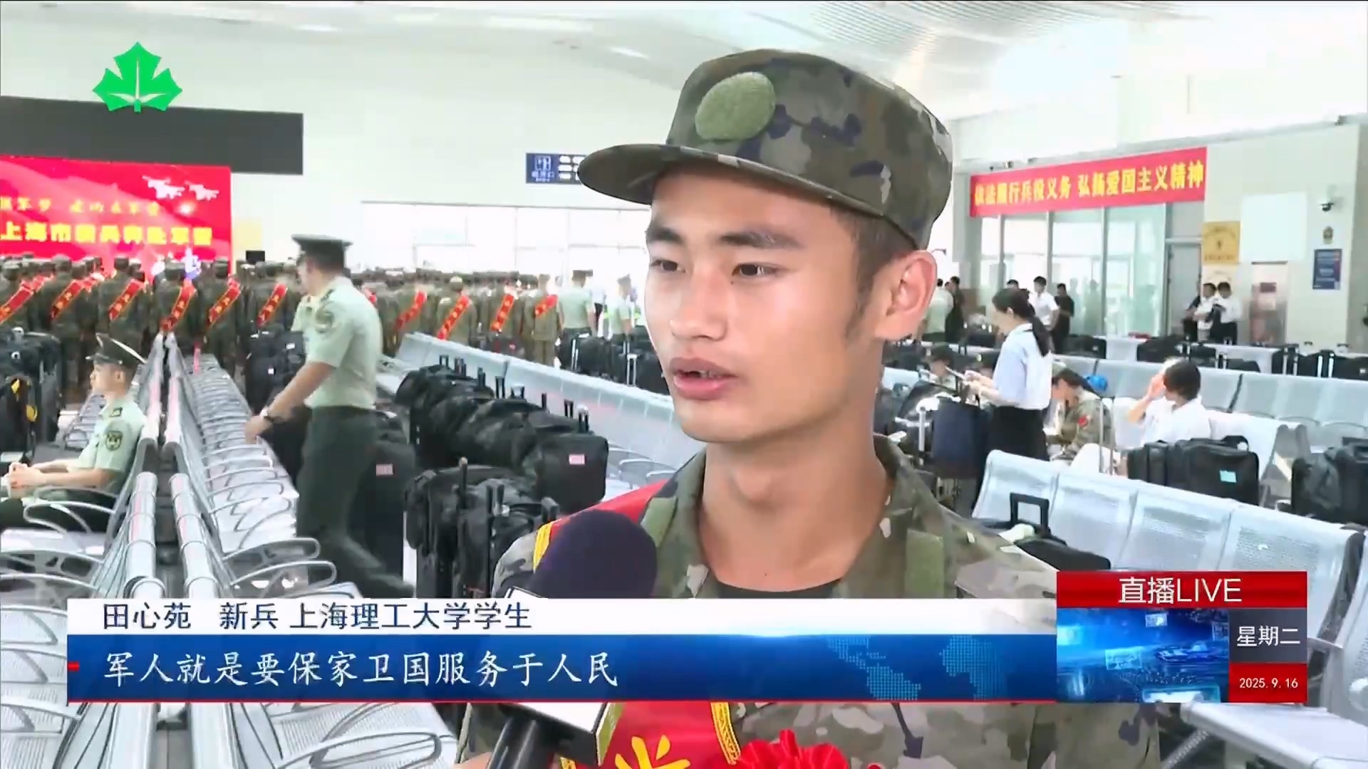 9月16日,上海市市委、市政府、上海警備區(qū)在上海火車站舉行新兵歡送儀式,我校基礎(chǔ)學(xué)院入伍大學(xué)生田心苑接受上海教育電視臺(tái)采訪,在采訪中,田心苑表示:“軍人就是要保家衛(wèi)國服務(wù)于人民,相信在部隊(duì)的歷練下,我也可以很好地履行這份責(zé)任,為國家貢獻(xiàn)出自己的力量。”