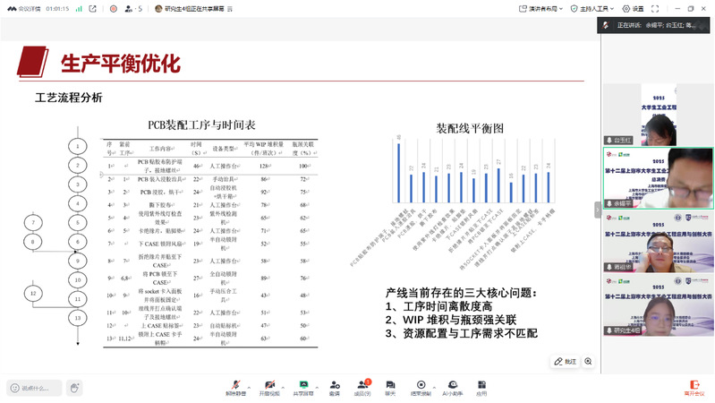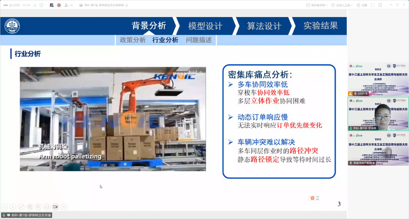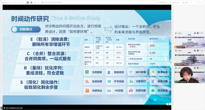 本次總決賽共有24支參賽隊伍,其中本科生組16支,研究生組8支。參賽作品涉及工業(yè)工程的多個領域,包括精益生產(chǎn)優(yōu)化、人因工程、AI視覺檢測、智慧APP開發(fā)等。通過8分鐘的匯報與5分鐘的答辯,參賽選手充分展示了他們的選題背景、解決方案及所取得的成果,得到了專家評委的肯定,也收獲了很多實用的意見和建議。