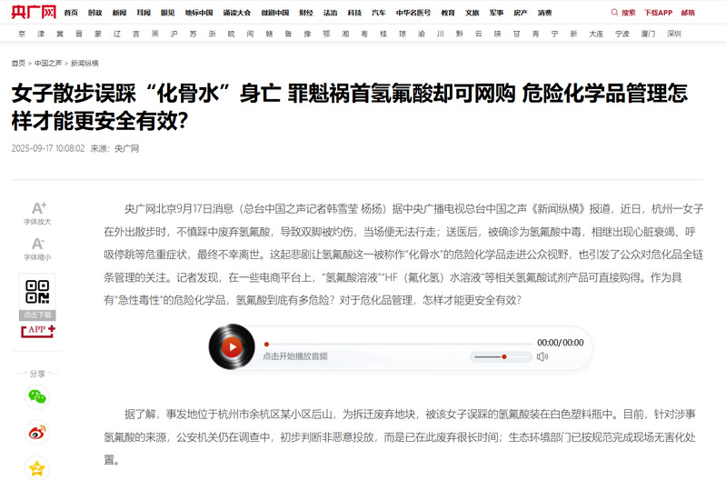 針對近期“杭州一女子因接觸廢棄氫氟酸中毒身亡”事件引發(fā)的社會(huì)廣泛關(guān)注,9月16日,上海理工大學(xué)管理學(xué)院院長、智慧應(yīng)急管理學(xué)院執(zhí)行院長趙來軍教授接受中央廣播電視總臺中國之聲專訪,就當(dāng)前危險(xiǎn)化學(xué)品市場亂象、互聯(lián)網(wǎng)銷售監(jiān)管漏洞、危化品廢棄物處置難題以及《危險(xiǎn)化學(xué)品安全法》即將出臺等關(guān)鍵議題發(fā)表專業(yè)見解。