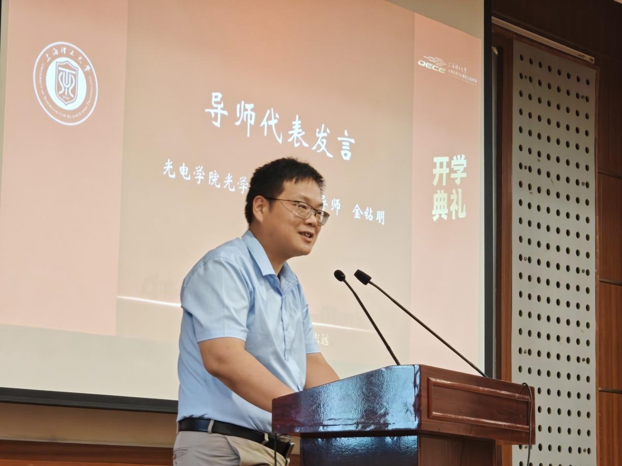 光電信息工程系教師金鉆明作為導(dǎo)師代表發(fā)言。他從“研究者素養(yǎng)養(yǎng)成”的視角,對新生提出期望。他指出,研究生階段的核心是從知識接受者轉(zhuǎn)變?yōu)橹R創(chuàng)造者,鼓勵同學(xué)們主動融入科研環(huán)境,充分利用學(xué)院先進(jìn)的實驗平臺與學(xué)術(shù)資源。他強(qiáng)調(diào),跨學(xué)科視野與團(tuán)隊協(xié)作能力至關(guān)重要,應(yīng)在交流合作中激發(fā)思維、實現(xiàn)創(chuàng)新突破。