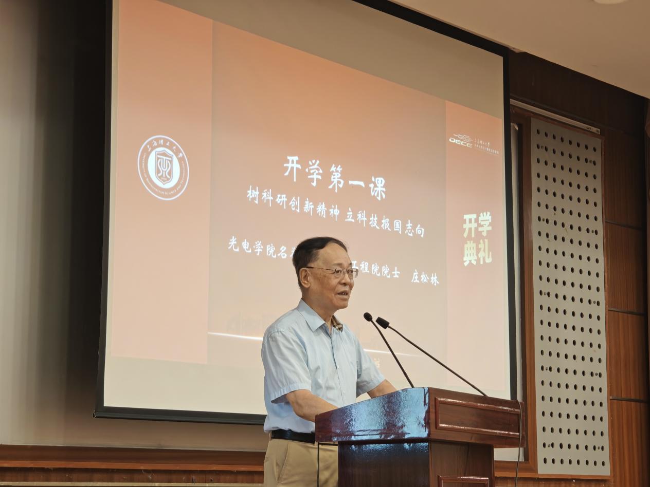 中國工程院院士、學(xué)院名譽(yù)院長莊松林以“最美的科研誓言就是愛黨愛國”為題,為新生講授《開學(xué)第一課》。他回顧了自己從艱苦求學(xué)至海外歸國的科研歷程,分享了對科學(xué)事業(yè)的熱愛與對祖國的深厚情感。莊院士感慨道,“再困難的時期,我都沒有停止讀書和思考”。他鼓勵打破單一學(xué)科局限,主動從人類文明中汲取營養(yǎng),培養(yǎng)跨界思維方式,融合科學(xué)精神與人文情懷,以拓寬科研道路。他勉勵光電學(xué)子既要腳踏實地夯實基礎(chǔ),更要志存高遠(yuǎn)、抬頭看路,以開放心態(tài)迎接挑戰(zhàn),以堅韌意志和使命成就夢想。
