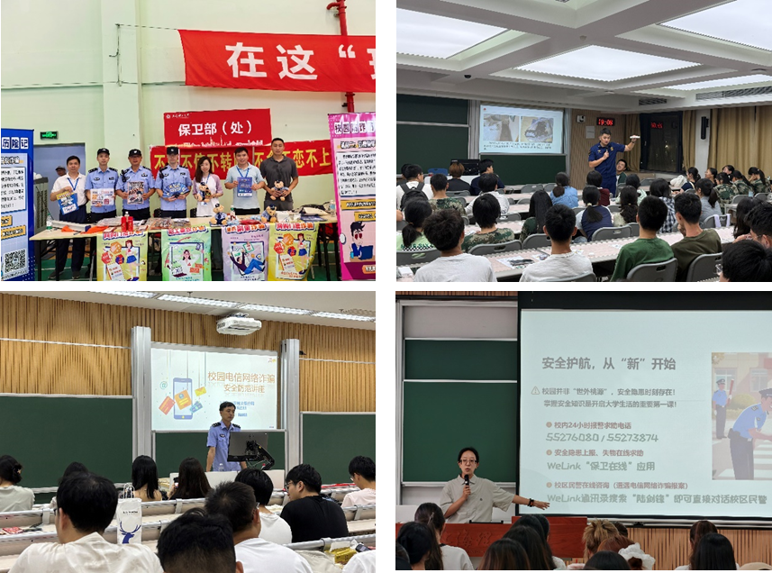 保衛(wèi)部(處)將新生入學(xué)報(bào)到和軍訓(xùn)期間作為校園安全教育的重要陣地,多措并舉打破安全教育“盲區(qū)”。隨錄取通知書寄送《上海理工大學(xué)校園安全告知書》,提前解析校園安全風(fēng)險(xiǎn)點(diǎn)供新生“避雷”;“平安上理”微信公眾號(hào)、Welink公眾號(hào)、校內(nèi)電子宣傳欄等提前發(fā)布相關(guān)安全提示;在各新生報(bào)到點(diǎn),學(xué)校與上海市公安局文化保衛(wèi)分局滬東高校派出所、長白新村派出所聯(lián)動(dòng)設(shè)置反詐和交通安全宣傳點(diǎn),官方微信公眾號(hào)增加“校園安全打卡”新生安全知識(shí)問答專欄,通過現(xiàn)場(chǎng)宣講、互動(dòng)答題、發(fā)放宣傳材料等在新生報(bào)到第一時(shí)間繃緊安全弦;本科新生軍訓(xùn)期間,保衛(wèi)部(處)聯(lián)合公安、消防等部門開展電信網(wǎng)絡(luò)詐騙防范講座和消防安全知識(shí)講座,并依托學(xué)校智慧教室直錄播平臺(tái)直播,做到新生群體無死角全覆蓋;保衛(wèi)部(處)還制作了綜合性校園安全指南PPT,由全體新生班主任將其作為新生入學(xué)認(rèn)知教育必修內(nèi)容,進(jìn)一步確保新生安全教育“到邊到底到位”。