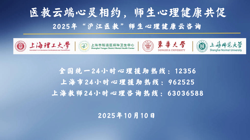10月10日,在第34個(gè)世界精神衛(wèi)生日來臨之際,學(xué)校聯(lián)合楊浦區(qū)精神衛(wèi)生中心、東華大學(xué)、上海師范大學(xué)共同開展2025年“滬江醫(yī)教”師生心理云咨詢活動(dòng)。