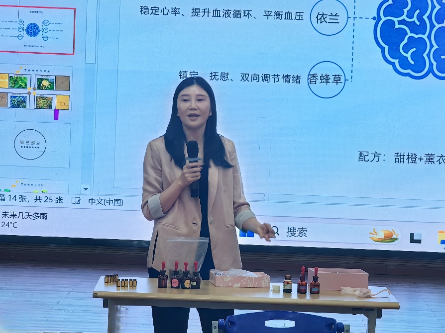 隨后,上海交通大學(xué)芳香植物研發(fā)中心實(shí)驗(yàn)室主任、香精香料工程師王文翠老師分享了緩解壓力及焦慮的精油選擇與配置方式。王老師詳細(xì)介紹了多種適合放松情緒、美容養(yǎng)生的植物精油的作用及使用方法,內(nèi)容豐富實(shí)用,引起了在場(chǎng)教師的濃厚興趣。在實(shí)踐環(huán)節(jié),王老師邀請(qǐng)教師們上臺(tái)親手配置自己喜歡的精油,現(xiàn)場(chǎng)氣氛熱烈,芳香四溢。
