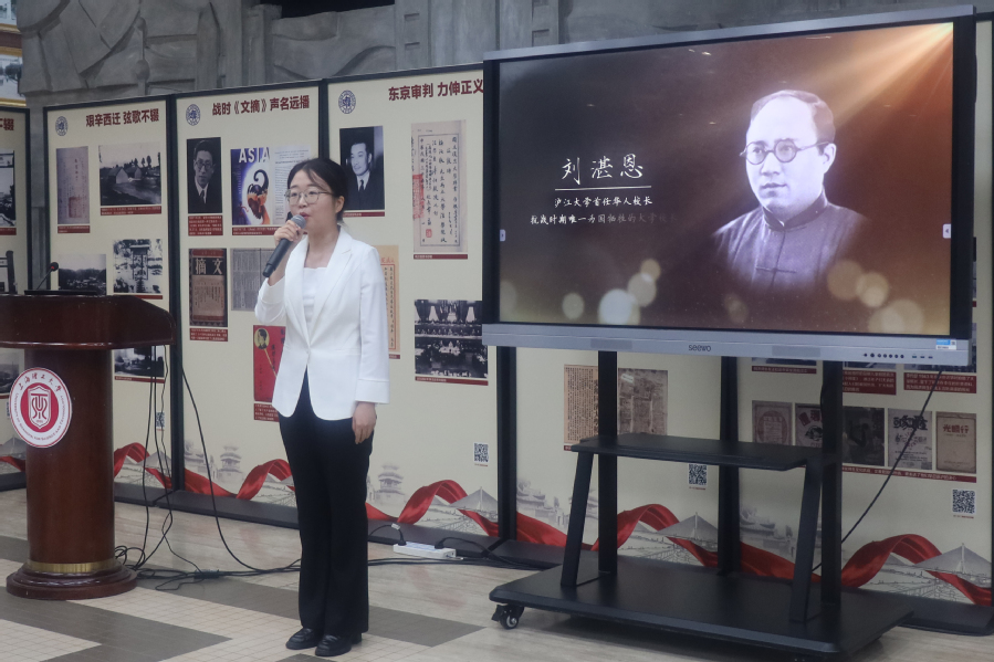 隨后,檔案館肖琳琳以眼鏡、書信為線索,深情講述了劉湛恩長校滬江推動中國化校政改革,抗戰(zhàn)爆發(fā)后堅定抗日不懼日偽威脅,最終遭日偽特務(wù)暗殺以身殉國的愛國事跡,在場師生無不動容。