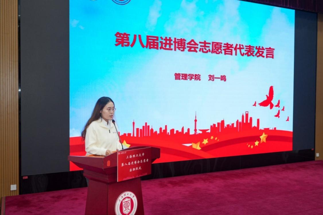 管理學(xué)院研究生劉一鳴作為本屆志愿者代表發(fā)言,講述了她從第一屆進(jìn)博會(huì)志愿者面試落選到后來成功入選第六屆進(jìn)博會(huì)志愿者,并在今年再次入選成為二年級(jí)“小葉子”的故事。