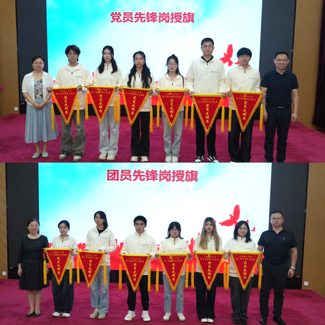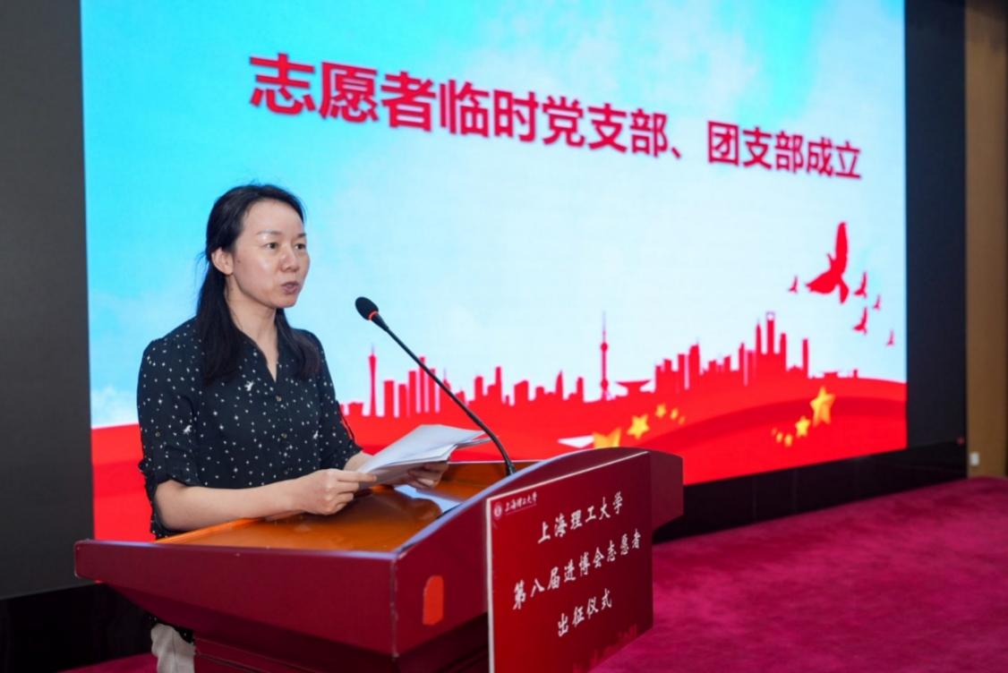 為更好地發(fā)揮黨、團(tuán)組織的戰(zhàn)斗堡壘作用,組織部副部長(zhǎng)鄭靜宣讀了《關(guān)于同意成立上海理工大學(xué)第八屆進(jìn)博會(huì)學(xué)生志愿者臨時(shí)黨支部的批復(fù)》《關(guān)于成立上海理工大學(xué)第八屆進(jìn)博會(huì)學(xué)生志愿者第一臨時(shí)團(tuán)支部、第二臨時(shí)團(tuán)支部的決定》。宣傳部副部長(zhǎng)牛翔宇、學(xué)工部副部長(zhǎng)劉偉為黨員先鋒崗授旗,教務(wù)處副處長(zhǎng)張魯潮、研工部副部長(zhǎng)王張琦為團(tuán)員先鋒崗授旗。