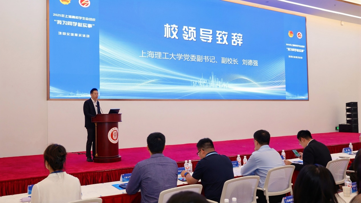 活動伊始,劉德強代表上海理工大學(xué)黨委向參加活動的師生代表表示最熱烈的歡迎和最誠摯的感謝。他指出,本次市級展示活動是深入學(xué)習(xí)貫徹習(xí)近平總書記關(guān)于學(xué)聯(lián)學(xué)生會工作重要論述的生動實踐,也是全面落實全國學(xué)聯(lián)二十八大精神、持續(xù)深化學(xué)生會組織改革的重要舉措。上海理工大學(xué)黨委始終堅持將學(xué)生會建設(shè)納入學(xué)?!叭恕惫ぷ鞲窬趾退枷胝谓逃ぷ黧w系中進(jìn)行整體謀劃,學(xué)校黨委大力支持學(xué)生會組織聚焦同學(xué)在思想成長、學(xué)業(yè)發(fā)展、身心健康、社會融入、權(quán)益維護(hù)等方面的現(xiàn)實需求,打造具有特色、富有實效的服務(wù)品牌。最后,他祝愿2025年上海高校學(xué)生會組織“我為同學(xué)做實事” 項目交流展示活動圓滿成功。