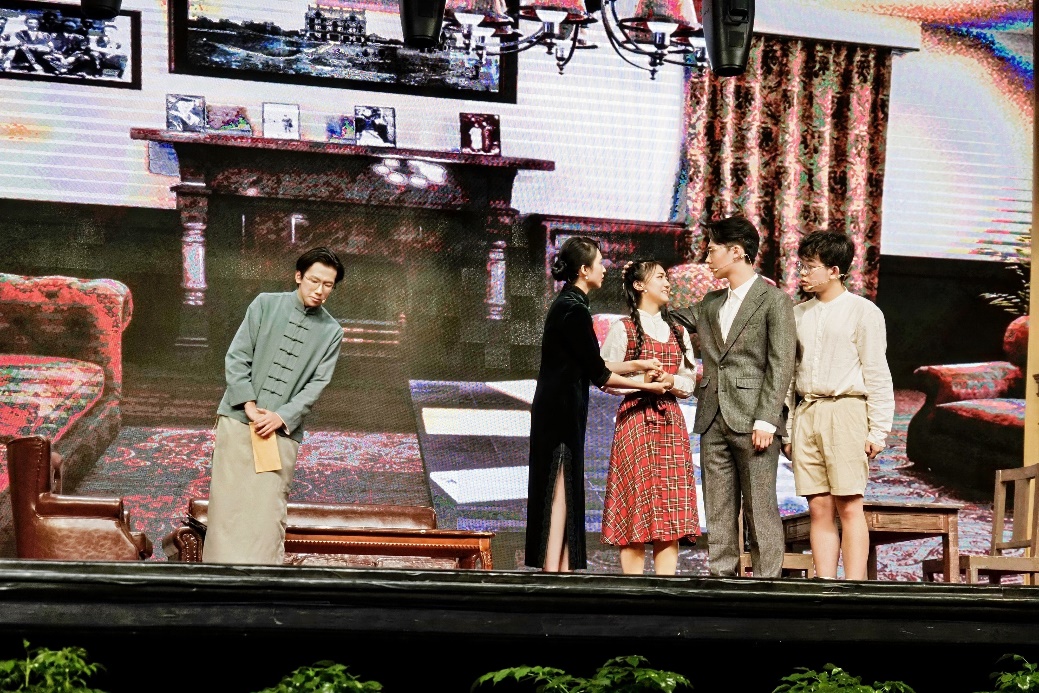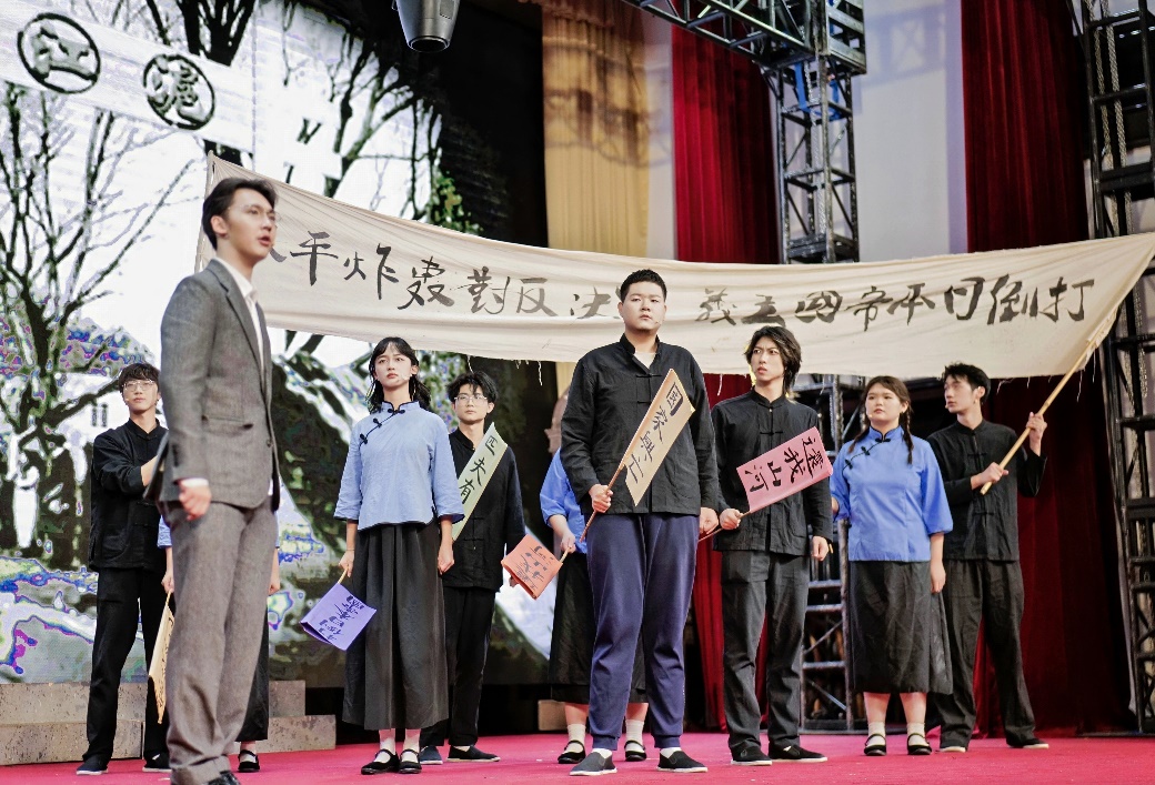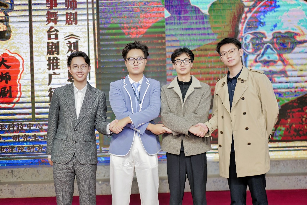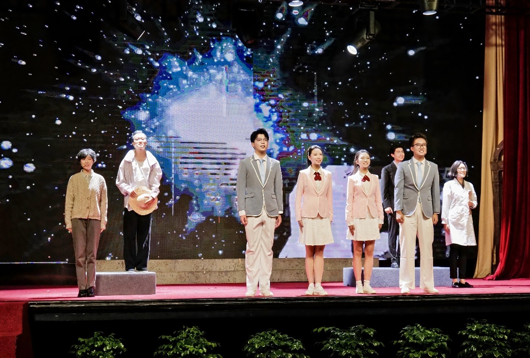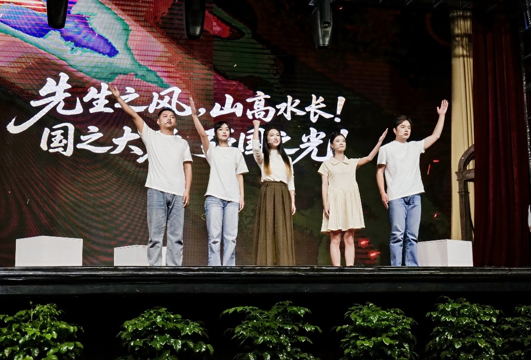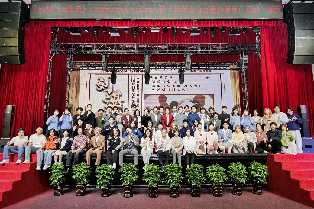 演出結(jié)束后,四任劉湛恩扮演者實(shí)現(xiàn)了"跨時(shí)空同臺(tái)",共同站在大禮堂舞臺(tái)上合影留念。