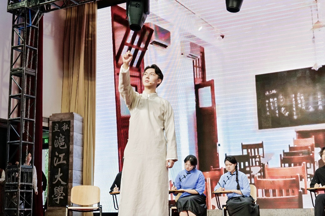 該劇以獨(dú)特的藝術(shù)手法,構(gòu)建了"歷史使命"與"家庭溫情"雙主線敘事。劇情采用倒序結(jié)構(gòu),從1938年劉湛恩校長(zhǎng)遭日偽特務(wù)暗殺的悲壯場(chǎng)景切入,層層回推至1928年他出任滬江大學(xué)校長(zhǎng)就職典禮的重要時(shí)刻。倒敘的敘事方式讓觀眾在懸念中逐步走近這位愛(ài)國(guó)教育家的內(nèi)心世界。劇目通過(guò)"教育救國(guó)、公民教育"的辦學(xué)理念,展現(xiàn)劉湛恩老校長(zhǎng)的遠(yuǎn)見(jiàn)卓識(shí);也有與女兒劉光坤對(duì)話的溫馨片段,還原他作為父親柔情的一面;在"滬江校園建設(shè)"場(chǎng)景中,演員們通過(guò)精湛的表演,再現(xiàn)了劉湛恩校長(zhǎng)帶領(lǐng)師生在戰(zhàn)亂年代堅(jiān)持辦學(xué)的艱辛歷程,當(dāng)"讀書(shū)不忘救國(guó),救國(guó)不忘讀書(shū)"的經(jīng)典臺(tái)詞響起時(shí),臺(tái)下總能響起經(jīng)久不息的掌聲。