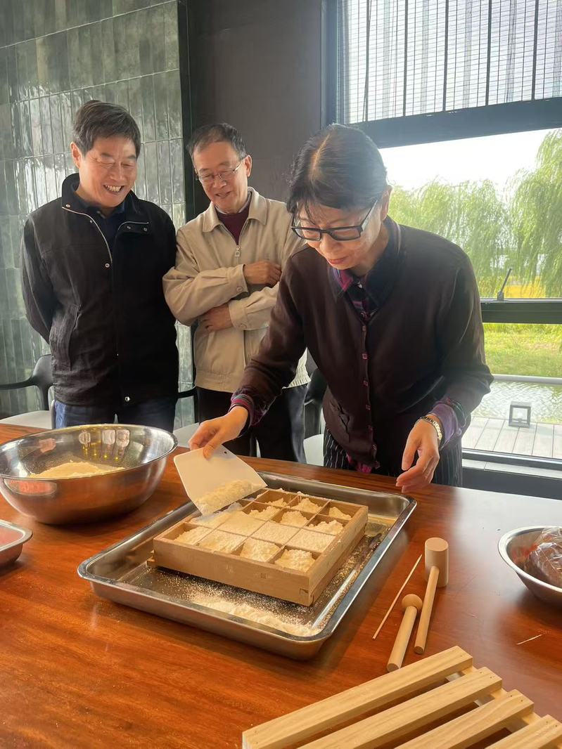 在非遺文化傳承——重陽(yáng)方糕制作環(huán)節(jié),大家挽起袖子動(dòng)手操作,揉粉、填餡、壓模、脫模,每一個(gè)步驟都細(xì)致認(rèn)真。老師們一邊制作,一邊分享過(guò)往教學(xué)與生活中的趣事,歡聲笑語(yǔ)不斷。隨后,一行人前往飛云島參觀鄉(xiāng)村振興示范點(diǎn)。據(jù)介紹,這一特色地標(biāo)的蛻變始于一座百年老宅的“涅槃重生”。金匯鎮(zhèn)墩頭村通過(guò)清退復(fù)墾碎片化、低效及閑置集體建設(shè)用地,依托優(yōu)越的交通與生態(tài)優(yōu)勢(shì)盤活土地資源,引入復(fù)合業(yè)態(tài)運(yùn)營(yíng),讓沉睡多年的歷史宅院迸發(fā)出“文化傳承+商業(yè)爆燃”的雙重活力。老教師們漫步在田野間,觸摸著古色古香的建筑構(gòu)件,聆聽(tīng)著鄉(xiāng)村活化利用的故事,感慨鄉(xiāng)村發(fā)展的創(chuàng)新與突破。?