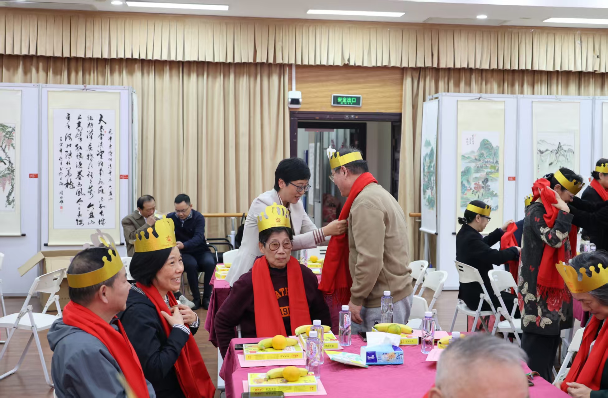 領(lǐng)導為壽星敬獻佩戴紅圍巾