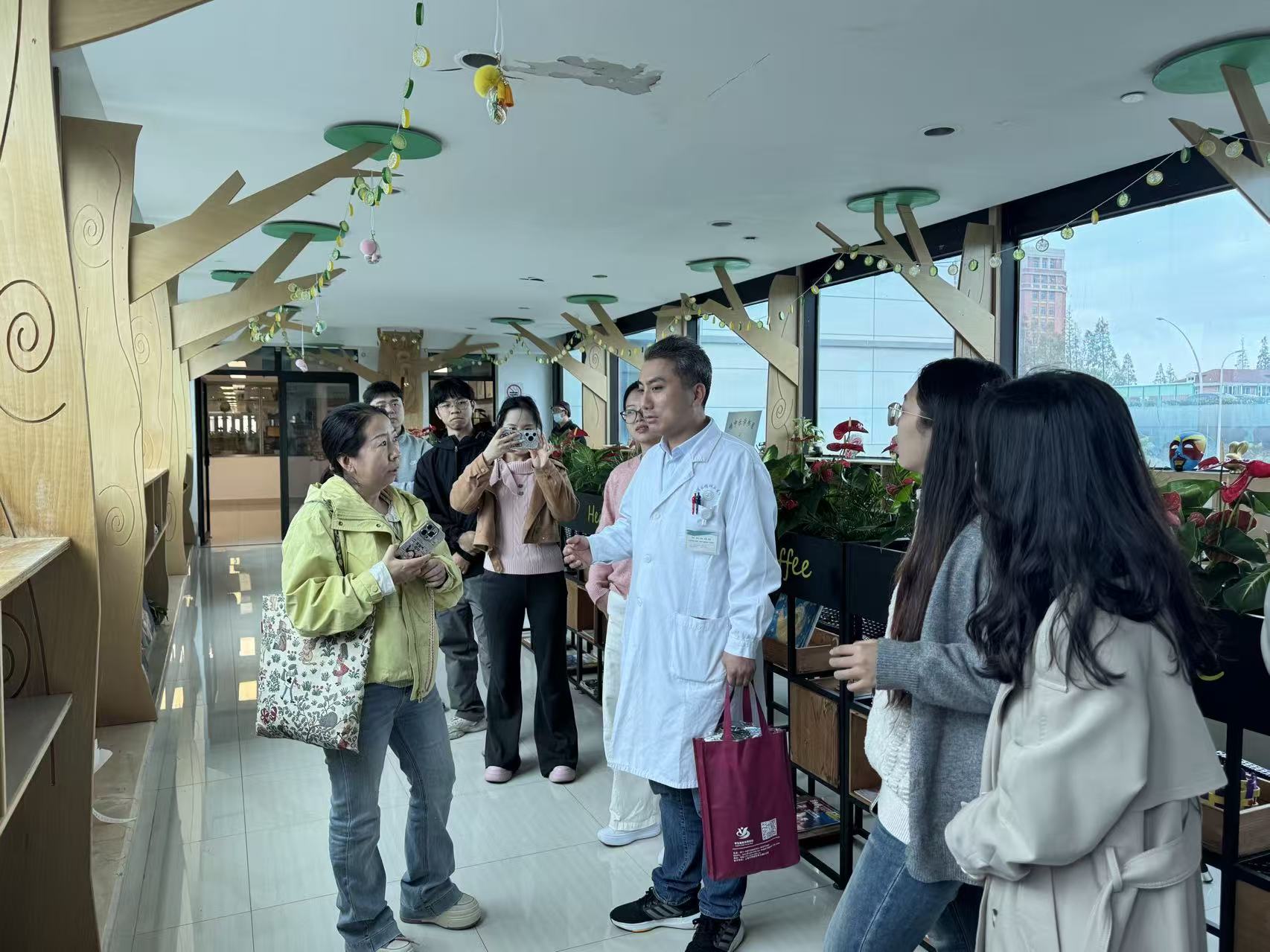在楊浦區(qū)精神衛(wèi)生中心李斌醫(yī)生的專業(yè)講解下,師生參觀了醫(yī)院住院部、門診診療區(qū)及特色康復區(qū)域。醫(yī)院精心打造的"文化展廳"成為參觀的亮點,展區(qū)內(nèi)陳列的患者創(chuàng)作——包括國風面具、書法作品及色彩鮮明的繪畫,展現(xiàn)了精神障礙患者在藝術(shù)表達中的情感世界與創(chuàng)造力。在康復治療區(qū),師生們看到患者參與的團體康復活動,也看到了來自病愈志愿者們在咖啡吧流暢的制作過程?,F(xiàn)磨咖啡與手工奶茶的香氣營造出溫馨舒適的氛圍,不僅體現(xiàn)了現(xiàn)代精神衛(wèi)生服務(wù)的進步,也打破了公眾對精神醫(yī)療機構(gòu)的傳統(tǒng)認知,彰顯了“以患者為中心”的康復理念。