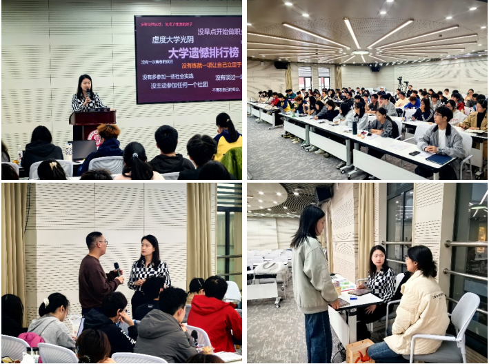 徐歐老師圍繞“認識自我·從容啟程”主題,系統(tǒng)開展四模塊指導。首講MBTI性格解析,強調非標簽化,聚焦性格與職業(yè)環(huán)境、團隊模式的適配邏輯;次析職場競爭力,提出“硬技能(技術能力)+軟素質(學習力、協(xié)作力)”雙輪策略,建議通過項目實踐積累“能力證據(jù)”;針對求職壓力,傳授目標拆解、社會支持系統(tǒng)構建等工具,助學生轉化焦慮為成長動能;末以“職場新人進階”收尾,詳解職業(yè)競爭力內涵,覆蓋學生思維到結果導向、溝通邊界感、團隊破冰術等實操要點,為從校園到職場的關鍵跨越提供全鏈條指引。