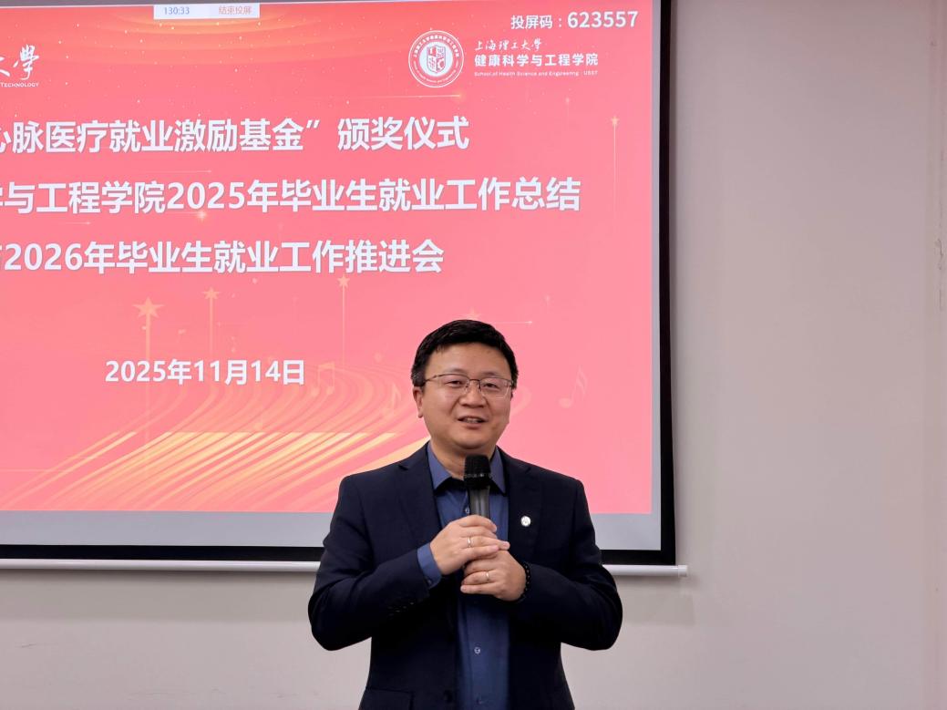 11月14日,上海理工大學(xué)“心脈醫(yī)療就業(yè)激勵(lì)基金”頒獎(jiǎng)儀式暨健康科學(xué)與工程學(xué)院2025屆畢業(yè)生就業(yè)工作總結(jié)與2026屆畢業(yè)生就業(yè)工作啟動(dòng)會(huì),在上海微創(chuàng)心脈醫(yī)療科技(集團(tuán))股份有限公司總部圓滿舉行。這次會(huì)議既是一次總結(jié)會(huì)、表彰會(huì),更是一次動(dòng)員會(huì)、推進(jìn)會(huì)。健康學(xué)院黨委書(shū)記姚秀雯、副書(shū)記李陳財(cái)、副院長(zhǎng)崔海坡,各系主任、專業(yè)負(fù)責(zé)人、獲獎(jiǎng)教師代表、畢業(yè)班輔導(dǎo)員;以及心脈醫(yī)療董事、總裁朱清,心脈醫(yī)療品質(zhì)、注冊(cè)與臨床資深總監(jiān)、黨支部書(shū)記馮曉鈺,人力資本與行業(yè)高級(jí)總監(jiān)張國(guó)盈,事務(wù)部總監(jiān)奚菊紅等企業(yè)代表等,齊聚一堂,共話人才培養(yǎng)與校企合作。會(huì)議由李陳財(cái)主持。