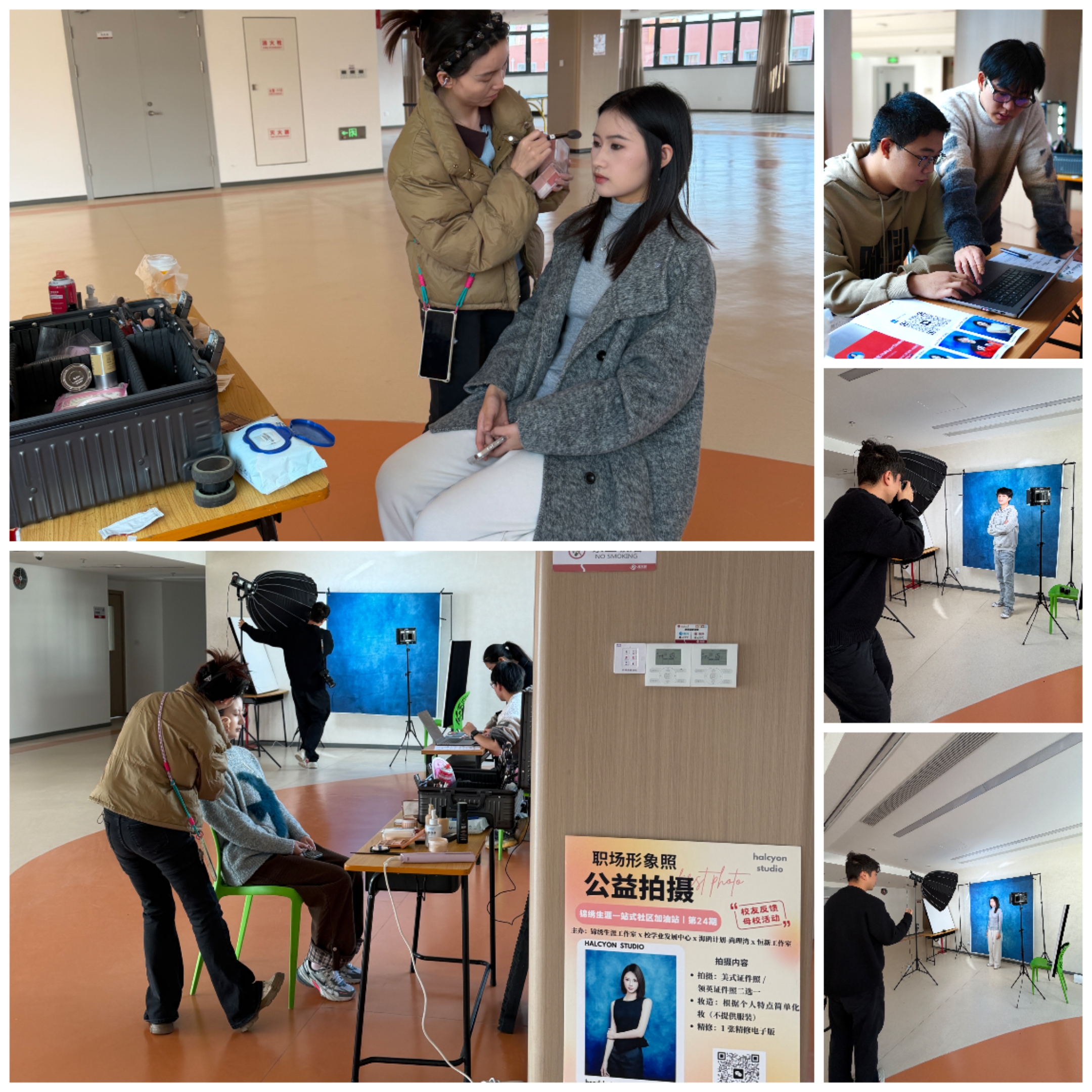 11月23日,錦繡生涯一站式社區(qū)加油站聯(lián)合2023屆李靖雯校友創(chuàng)立的Halcyon恒新工作室,攜專業(yè)攝影團(tuán)隊(duì),在學(xué)生發(fā)展中心五樓大廳,為學(xué)生打造閃亮職業(yè)名片,分批完成美式或領(lǐng)英風(fēng)格職場(chǎng)形象照的拍攝,為求職簡(jiǎn)歷增添關(guān)鍵一筆。