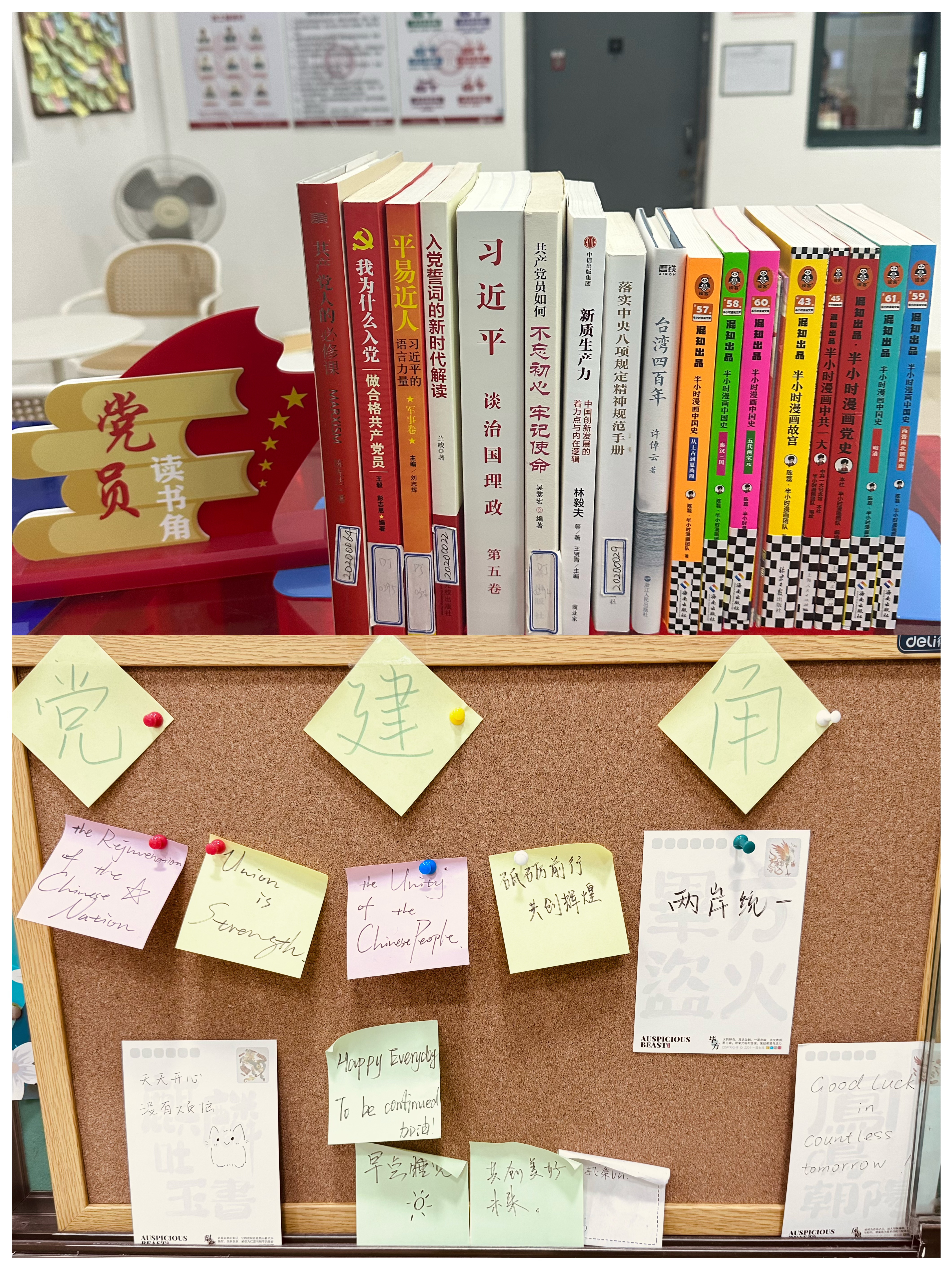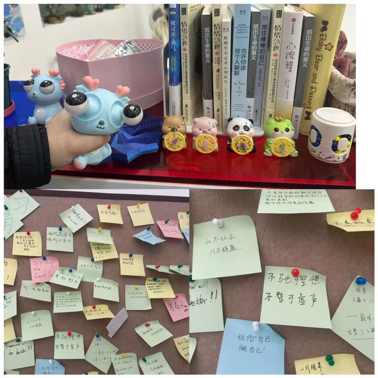 “學(xué)習(xí)漂流瓶”和“心靈驛站”則為同學(xué)們提供了知識(shí)共享與情感交流的平臺(tái)。同學(xué)們?cè)诖朔窒韺W(xué)習(xí)心得、推薦好書、記錄感悟,并通過(guò)減壓玩具與書籍閱讀放松身心,營(yíng)造出安靜溫馨、互助成長(zhǎng)的宿舍文化角落。