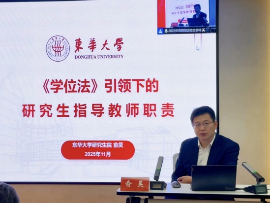 11月5日的開班儀式上,研究生院院長崔國民首先代表學(xué)校向通過嚴(yán)格遴選的導(dǎo)師隊伍新成員表示熱烈祝賀與誠摯歡迎。他強(qiáng)調(diào),研究生導(dǎo)師作為研究生培養(yǎng)的第一責(zé)任人,肩負(fù)著“傳播知識、傳播思想、傳播真理,塑造靈魂、塑造生命、塑造新人”的時代重任,其履職能力直接關(guān)系到學(xué)校研究生教育質(zhì)量與高層次人才培養(yǎng)成效。東華大學(xué)研究生院常務(wù)副院長俞昊教授受邀作題為“《學(xué)位法》引領(lǐng)下的研究生指導(dǎo)教師職責(zé)”的專題輔導(dǎo)。報告中,俞昊基于多年研究生教育管理經(jīng)驗與實踐積累,系統(tǒng)解讀《學(xué)位法》為研究生培養(yǎng)工作及導(dǎo)師職責(zé)賦予的新內(nèi)涵和制度導(dǎo)向。他強(qiáng)調(diào),導(dǎo)師應(yīng)自覺成為研究生學(xué)術(shù)研究的引領(lǐng)者、學(xué)術(shù)規(guī)范的守護(hù)者和成長成才的護(hù)航者,切實履行《學(xué)位法》賦予的責(zé)任與使命。