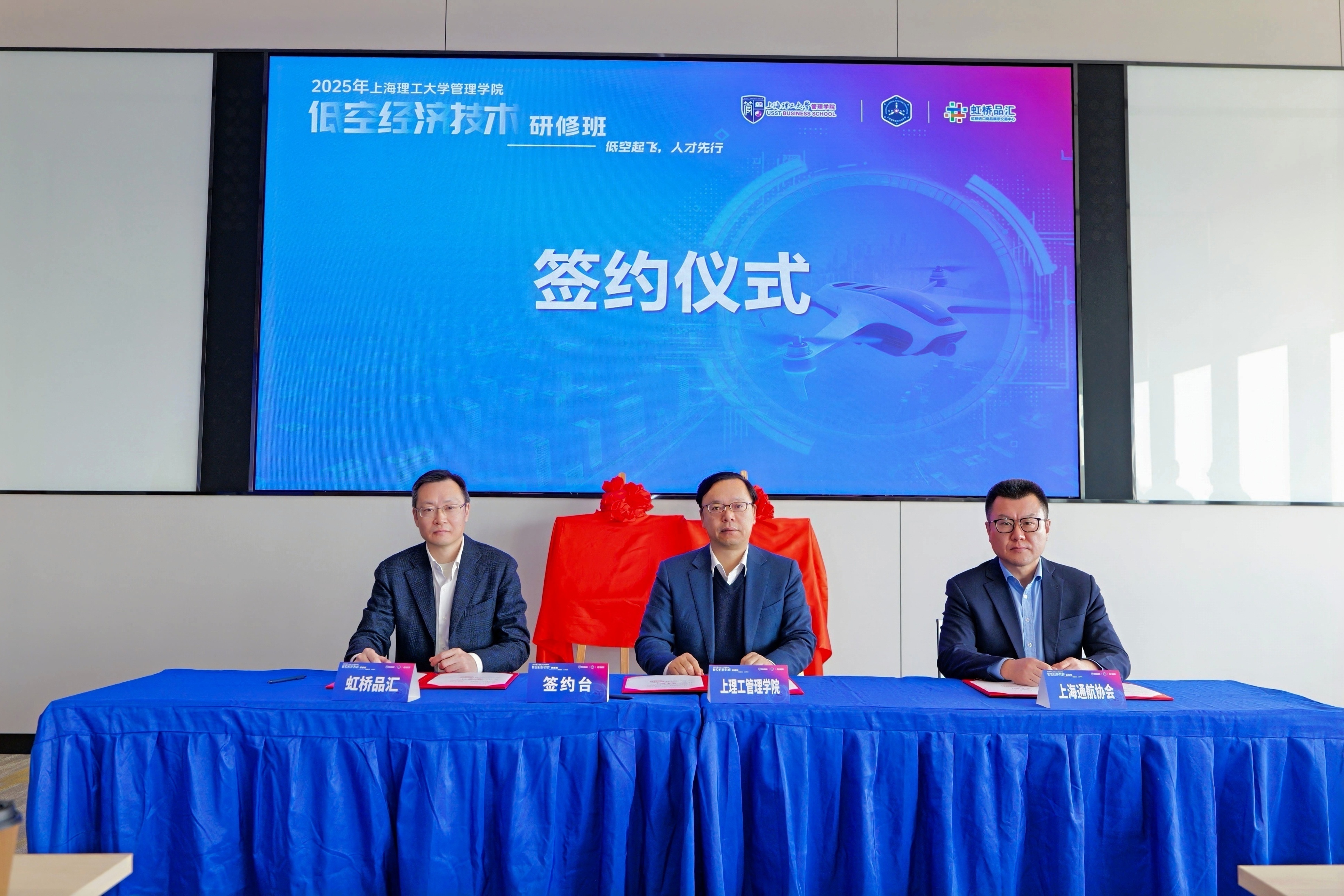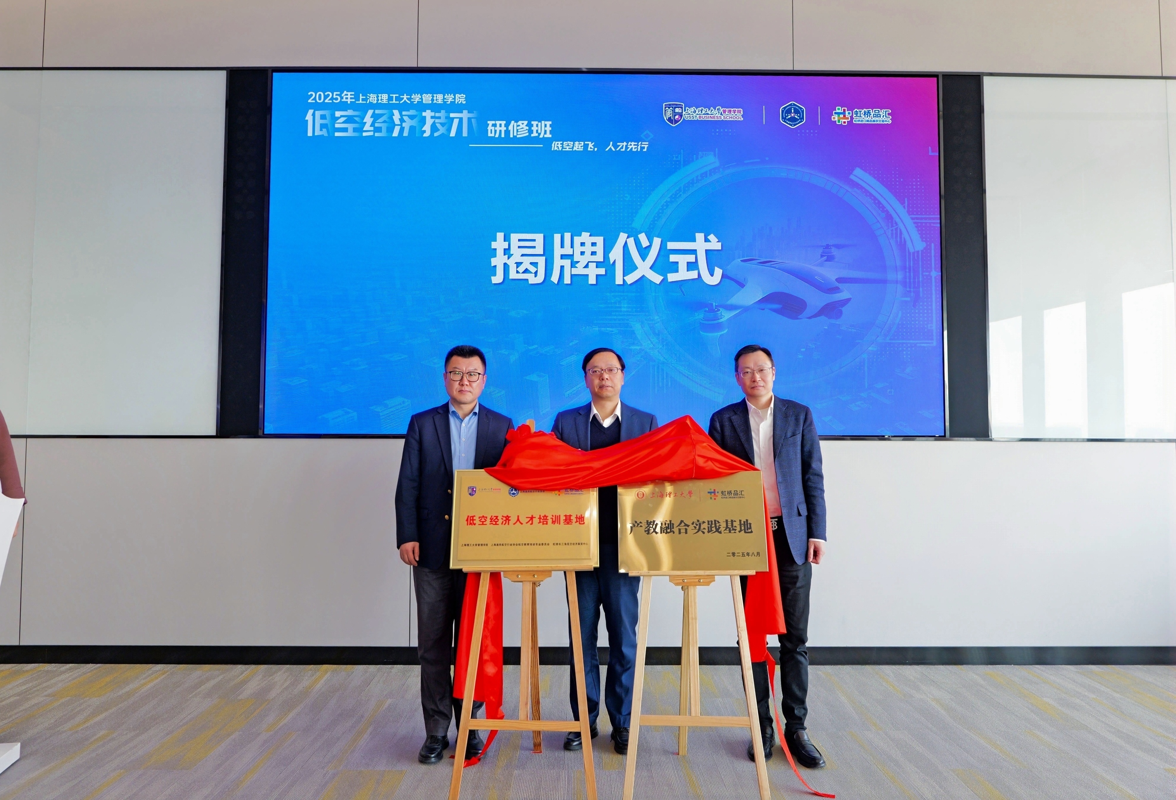 簽約儀式上,管理學院院長趙來軍、虹橋展貿(mào)中心總經(jīng)理蔡軍、上海通用航空行業(yè)協(xié)會教育培訓專委會主任委員丁捷共同為“低空經(jīng)濟人才培訓基地”和“產(chǎn)教融合實踐基地”揭牌,標志著管理學院在低空經(jīng)濟領域的產(chǎn)教融合步入實質(zhì)性推進階段。