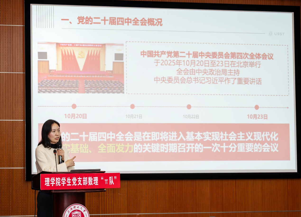 李曉慶以《學(xué)習(xí)貫徹黨的二十屆四中全會(huì)精神——為高質(zhì)量發(fā)展培養(yǎng)卓越理科創(chuàng)新人才》為題作專題報(bào)告,圍繞黨的二十屆四中全會(huì)基本概況、準(zhǔn)確把握“十五五”時(shí)期在基本實(shí)現(xiàn)社會(huì)主義現(xiàn)代化進(jìn)程中的重要地位、深刻領(lǐng)會(huì)“十五五”時(shí)期經(jīng)濟(jì)社會(huì)發(fā)展的指導(dǎo)方針和主要目標(biāo)、全面理解“十五五”時(shí)期經(jīng)濟(jì)社會(huì)發(fā)展的戰(zhàn)略任務(wù)和重大舉措、堅(jiān)持和加強(qiáng)黨的全面領(lǐng)導(dǎo),凝聚起推進(jìn)中國(guó)式現(xiàn)代化的磅礴力量等五個(gè)方面展開(kāi),深入淺出地為全體黨員如何踐行科技報(bào)國(guó)使命、履行黨員義務(wù)提供了清晰的思想指引與行動(dòng)指南。
