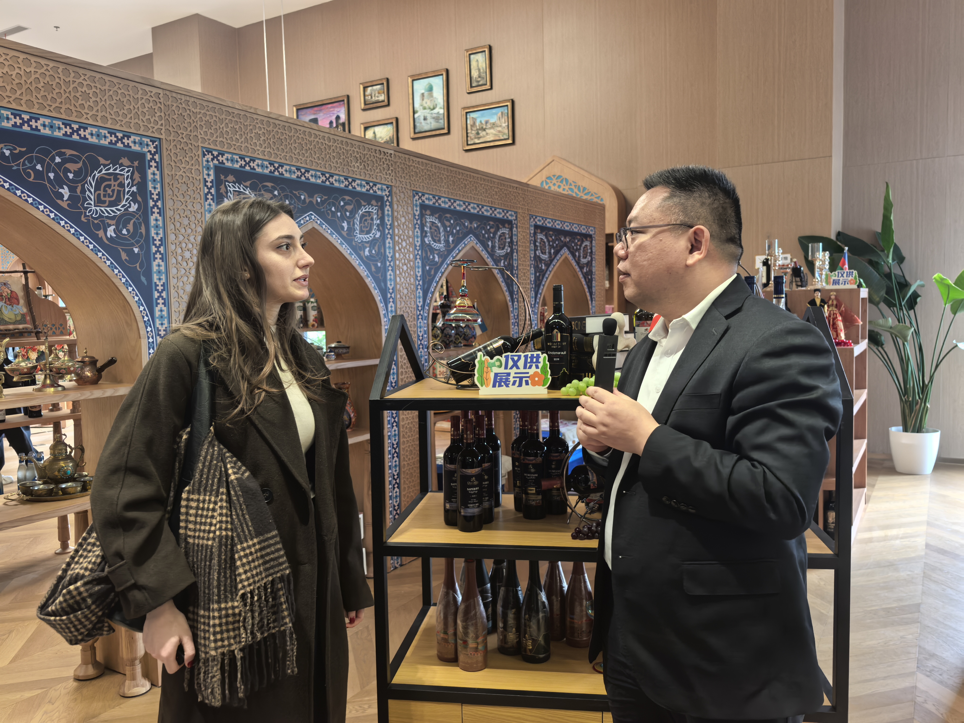 活動(dòng)現(xiàn)場(chǎng),上海外高橋保稅區(qū)國際人才服務(wù)有限公司工作人員詳細(xì)解讀了平臺(tái)的運(yùn)營模式與各國商品展示特色,從敘利亞的手工精油香皂、伊朗的純手工羊毛地毯,到大洋洲的紅酒、奶制品等,體現(xiàn)出各國產(chǎn)業(yè)特色與發(fā)展差異,不少同學(xué)在各自國家的展館前駐足,看到熟悉的特色商品與生活用品時(shí)紛紛駐足交流,深切體會(huì)到中外貿(mào)易往來帶來的文化共鳴與生活聯(lián)結(jié),學(xué)生們不僅聆聽講解,也積極參與互動(dòng)。在格魯吉亞展臺(tái),學(xué)生Nina主動(dòng)介紹本國特色酒類;在俄羅斯展臺(tái),ARSENII分享了俄羅斯的傳統(tǒng)酒品與食品,現(xiàn)場(chǎng)交流氣氛熱烈。工作人員還系統(tǒng)梳理了自貿(mào)區(qū)的發(fā)展脈絡(luò)——從1990年保稅區(qū)設(shè)立推動(dòng)外資獨(dú)資落地,到2013年自貿(mào)試驗(yàn)區(qū)實(shí)施負(fù)面清單管理,貿(mào)易便利化改革與政策創(chuàng)新持續(xù)深化,讓學(xué)子們直觀感受到自貿(mào)區(qū)建設(shè)與社會(huì)發(fā)展的緊密聯(lián)動(dòng)。
