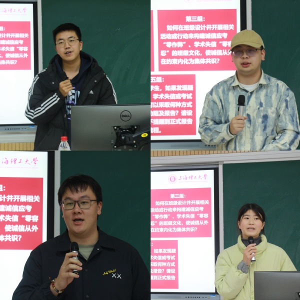 在專題研討環(huán)節(jié)中,與會骨干劃分為五個小組,分別聚焦于“如何智慧拒絕并轉(zhuǎn)化作弊請求”“如何識別與化解僥幸心理并提供學業(yè)支持”“如何設(shè)計行動以建設(shè)‘零作弊、零容忍’的班級誠信文化”等五個議題展開深度研討?,F(xiàn)場討論氣氛十分熱烈,不同視角、不同思想不斷碰撞,各小組成員在輔導員的引導下,結(jié)合身邊實際,剖析問題根源、模擬應(yīng)對場景、共商可行方案。隨后,各小組代表展示小組研討成果,從“友善而堅定”的拒絕話術(shù)到“學業(yè)幫扶小組”的運作設(shè)想,從誠信承諾書的想法到系統(tǒng)化勸阻不誠信行為的分級干預流程,小組代表們匯報了一系列兼具思想性與操作性的策略建議,這生動展現(xiàn)了學生骨干們從“知”到“行”的思考躍遷與實踐智慧。