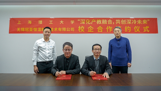 簽約儀式上,雙方圍繞人才培養(yǎng)、關(guān)鍵技術(shù)聯(lián)合攻關(guān)及科研成果轉(zhuǎn)化等方面進(jìn)行了深入交流。冠亞技術(shù)總監(jiān)仝高強(qiáng)在致辭中對學(xué)校一行的到來表示歡迎,并介紹了企業(yè)近年來的發(fā)展情況。劉寶林院長回顧了上海理工大學(xué)能源與動(dòng)力工程學(xué)院的發(fā)展歷程,重點(diǎn)介紹了在制冷與低溫工程領(lǐng)域的學(xué)科特色和人才培養(yǎng)成果,強(qiáng)調(diào)校企合作是推動(dòng)產(chǎn)教融合、服務(wù)國家“雙碳”戰(zhàn)略和高端裝備產(chǎn)業(yè)發(fā)展的重要路徑。產(chǎn)業(yè)學(xué)院執(zhí)行院長陳曦教授表示,產(chǎn)業(yè)學(xué)院將依托高??蒲信c人才優(yōu)勢,緊密對接企業(yè)需求,在工程實(shí)踐、技術(shù)攻關(guān)和成果轉(zhuǎn)化等方面深化協(xié)同合作,探索產(chǎn)教融合的長效機(jī)制,助力深低溫制冷技術(shù)創(chuàng)新發(fā)展。最后,總經(jīng)理顏厥枝系統(tǒng)闡述了無錫冠亞在深低溫制冷系統(tǒng)研發(fā)與工程應(yīng)用方面的整體布局和發(fā)展規(guī)劃,表示希望通過校企協(xié)同創(chuàng)新,持續(xù)提升企業(yè)技術(shù)水平和核心競爭力。