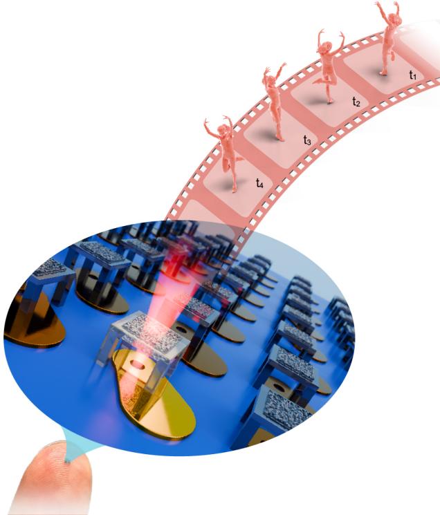 實現(xiàn)芯片化的關(guān)鍵,是團隊采用的3D激光納米打印技術(shù),他們在比頭發(fā)絲還細(xì)的激光器端面上,直接“雕刻”出精細(xì)的光學(xué)結(jié)構(gòu)。每個單元只有100微米見方,卻集成了激光源和全息器件于一身。團隊構(gòu)建了2×2陣列的芯片,實現(xiàn)1.93 GHz的超高全息刷新速率,比現(xiàn)有商用全息設(shè)備快六個數(shù)量級。這意味著它可以在1秒內(nèi)完成傳統(tǒng)設(shè)備需要一個月才能完成的全息幀切換。更值得一提的是,該芯片還具備動態(tài)3D顯示能力,通過切換不同注入電流,可在不同成像平面呈現(xiàn)清晰的全息圖像。