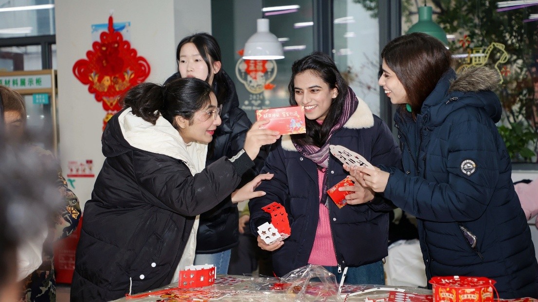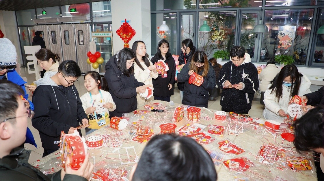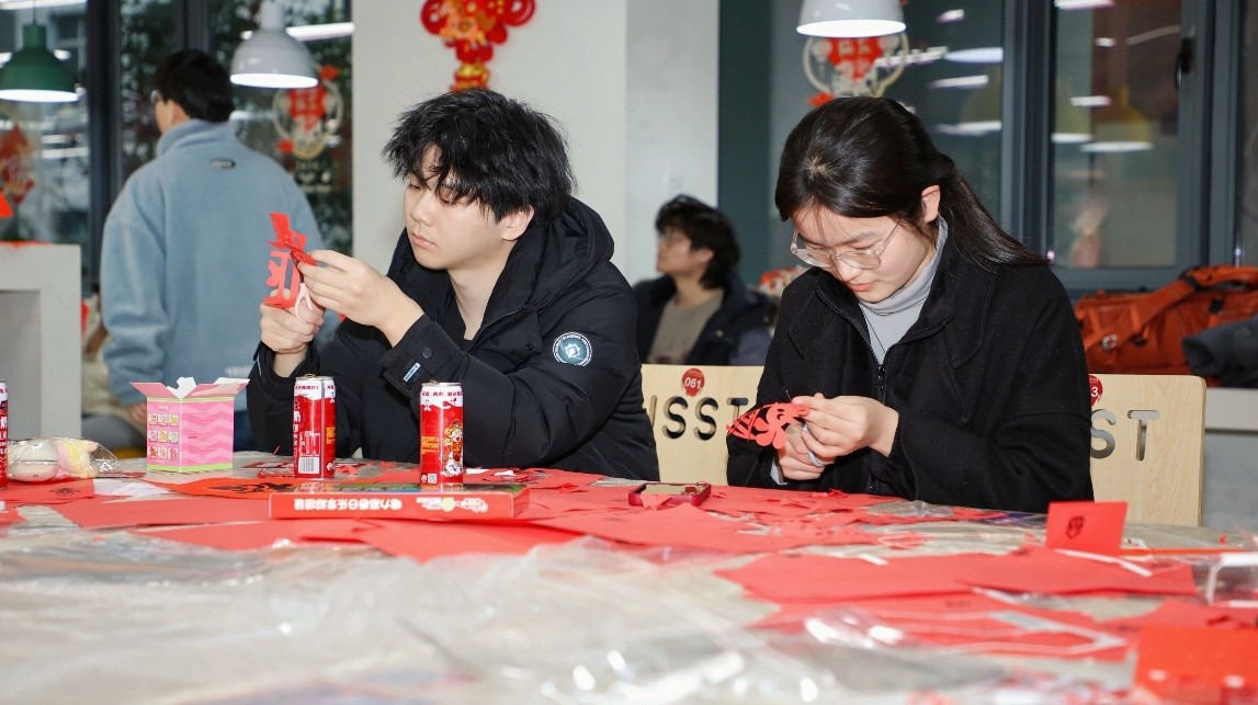 現(xiàn)場(chǎng)紅燈籠高掛、福字點(diǎn)綴,猜燈謎、做窗花、投壺、寫(xiě)春聯(lián)等經(jīng)典項(xiàng)目依次鋪開(kāi)。學(xué)子們或凝神解謎、或巧手剪窗花、或趣味投壺互動(dòng)、或揮毫寫(xiě)春聯(lián),將新春的美好期許凝于指尖、融于筆墨。不少國(guó)際生也主動(dòng)加入,在親身體驗(yàn)中探尋中國(guó)春節(jié)的文化底蘊(yùn),現(xiàn)場(chǎng)處處洋溢著團(tuán)圓祥和的節(jié)日氣息。