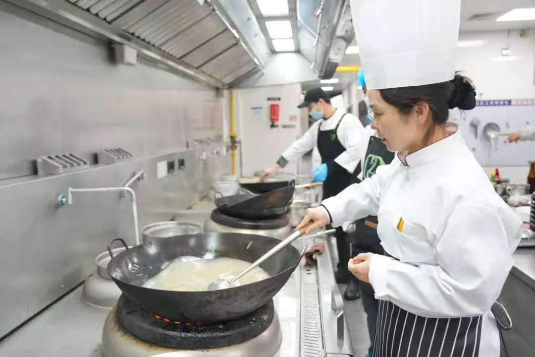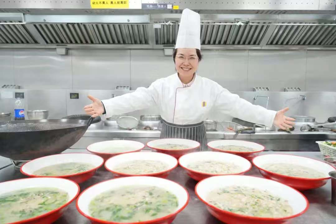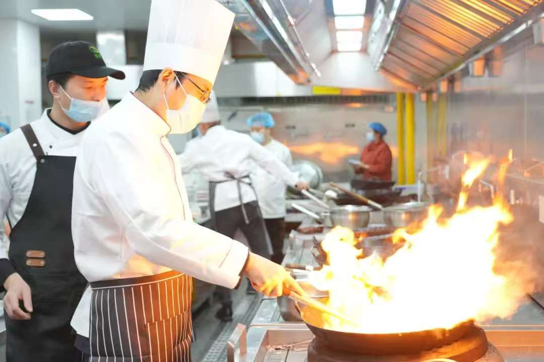 校領導們系著圍裙,戴著廚師帽,正將剛出鍋的宮保雞丁、可樂雞翅等裝盤