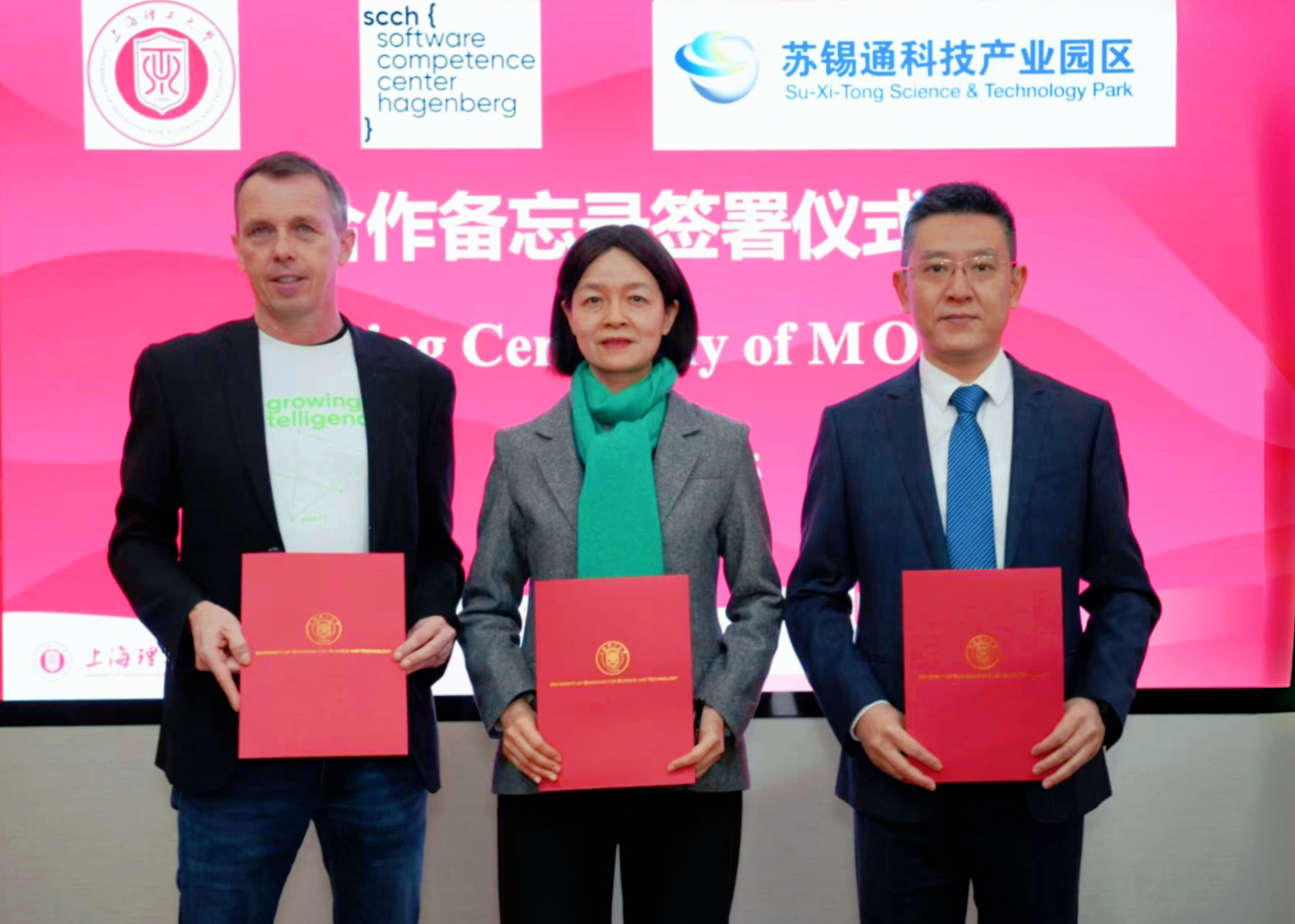會(huì)上,三方正式簽署了合作備忘錄,并就未來合作方向和重點(diǎn)領(lǐng)域進(jìn)行了交流與展望。會(huì)后,奧地利哈根貝格軟件能力中心及蘇錫通科技產(chǎn)業(yè)園區(qū)一行參觀了我校中德國際學(xué)院實(shí)驗(yàn)室,實(shí)地了解了我校的教學(xué)科研環(huán)境與成果。