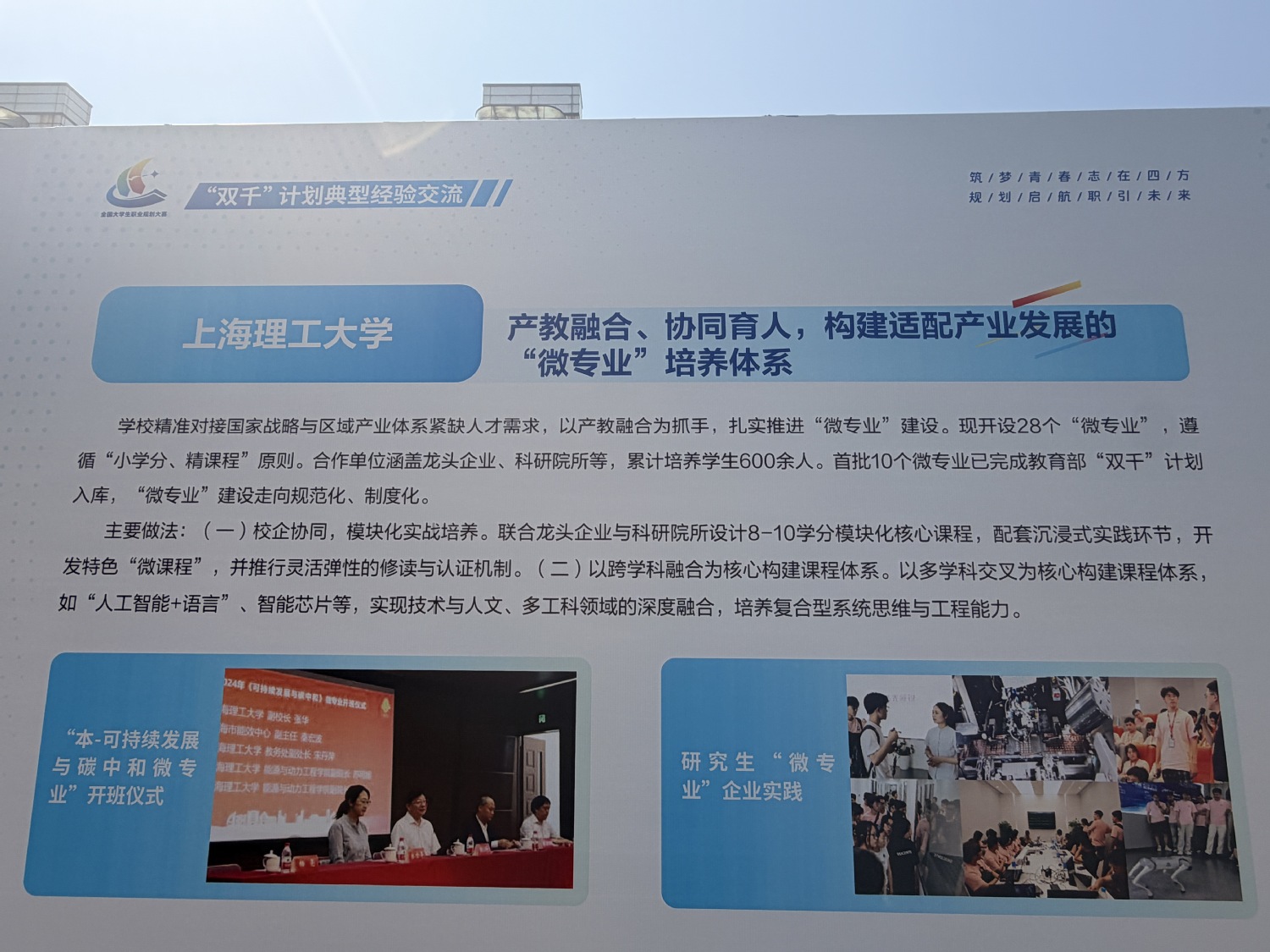 大賽期間,教育部開設(shè)了主題為“‘雙千’賦能,向需而行”的高校學(xué)生就業(yè)能力提升“雙千”計(jì)劃典型經(jīng)驗(yàn)交流展。我校堅(jiān)持產(chǎn)教融合、協(xié)同育人,構(gòu)建了適配產(chǎn)業(yè)發(fā)展的“微專業(yè)”培養(yǎng)體系,首批10個(gè)“微專業(yè)”已完成教育部“雙千”計(jì)劃入庫(kù)。