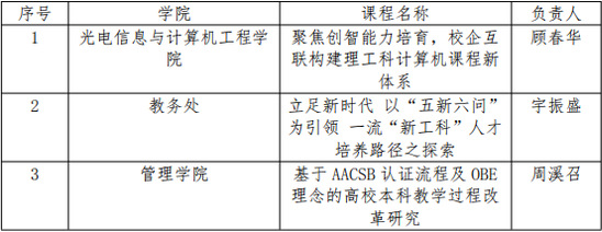 近日,上海市教委發(fā)布《上海市教育委員會關于公布2019年度上海高校本科重點教改項目立項名單的通知》(滬教委高〔2019〕9號),公布了2019年度上海高校本科重點教改項目的立項名單,全市共評選出99個立項項目,我校向市教委推薦申報的“聚焦創(chuàng)智能力培育,校企互聯(lián)構建理工科計算機課程新體系”等3個項目成功獲批。本科教育教學改革項目工作是深化我校本科教學改革、培育高水平教學成果、提升教學水平和人才培養(yǎng)質量、推進學校發(fā)展的一項重要舉措。市級教改項目申報工作的圓滿完成,反映出學校本科教育教學的研究內容更加聚焦,方向更加明確,水平顯著提高,教師積極研究教學、探索教學研究與改革的氛圍日漸濃厚。近年來,學校以提高教學質量為核心,旨在切實推進教育創(chuàng)新,深化教學改革,促進現(xiàn)代信息技術在教學中的應用,共享優(yōu)質教學資源,全面提高教育教學質量,帶動了學校課程建設整體水平和人才培養(yǎng)質量的提高。我校2019年度上海高校本科重點教改項目匯總表序號學院課程名稱負責人1光電信息與計算機工程學院聚焦創(chuàng)智能力培育,校企互聯(lián)構建理工科計算機課程新體系顧春華2教務處立足新時代以“五新六問”為引領一流“新工科”人才培養(yǎng)路徑之探索宇