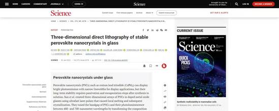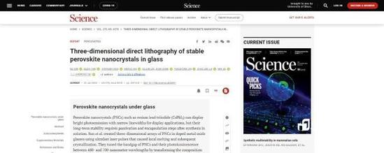 我們的日常工作和生活正在被各種屏幕包圍:手機、電腦、平板、電視、腕表……但這些都屬于二維屏幕,即使近年來悄然興起的裸眼3D也只是利用人們的雙眼視差來“欺騙”視覺神經(jīng),讓大腦以為看到的是3D圖像。如何基于屏幕裝置本身的改進,實現(xiàn)真正的三維立體顯示?近日,上海理工大學(xué)光子芯片研究院顧敏院士團隊聯(lián)合浙江大學(xué)邱建榮教授團隊和之江實驗室譚德志博士團隊在納米材料全息顯示取得重大突破,通過在無色透明的玻璃內(nèi)部實現(xiàn)帶隙可控的三維(3D)半導(dǎo)體量子結(jié)構(gòu),推開了新型立體彩色顯示器的“大門”。北京時間1月21日,相關(guān)研究成果發(fā)表在國際頂級期刊《科學(xué)》上,這也是上海理工大學(xué)教師首次以(共同)第一作者身份在《科學(xué)》正刊上發(fā)表論文,標志著學(xué)??蒲兴竭~上了新的臺階??鐚W(xué)科攻關(guān),點亮全球首塊納米三維立體從《星球大戰(zhàn)》中漂浮在空中的影像,到鄧麗君跨越時空與歌手周深在2022跨年演唱會上“合唱”《大魚》,立體顯示的概念被越來越多的人所熟知。全息技術(shù)為完整三維信息重現(xiàn)提供了實現(xiàn)方式,被業(yè)界認為是實現(xiàn)立體顯示最有前途的一種技術(shù)手段。但全息技術(shù)必須通過一定的介質(zhì),將影像投射到上面,才能顯現(xiàn)出來。之前美日科學(xué)家分別用蒸汽幕和激