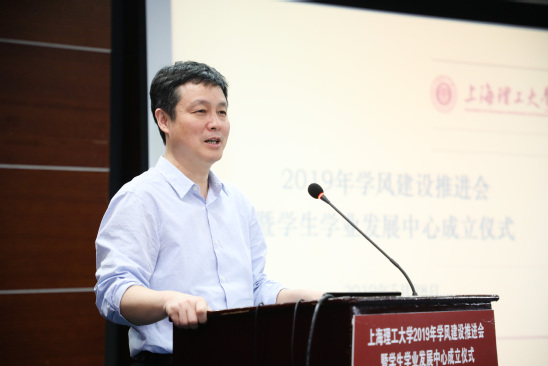 為進(jìn)一步加強(qiáng)學(xué)生學(xué)業(yè)發(fā)展指導(dǎo)工作,推進(jìn)優(yōu)良學(xué)風(fēng)建設(shè),統(tǒng)籌全校資源,搭建學(xué)生學(xué)業(yè)困難幫扶體系和能力提升體系,5月28日上午,上海理工大學(xué)2019年學(xué)風(fēng)建設(shè)推進(jìn)會(huì)暨學(xué)生學(xué)業(yè)發(fā)展中心成立儀式在圖文信息中心一樓報(bào)告廳舉行。校長(zhǎng)丁曉東,校黨委副書記、副校長(zhǎng)盛春,副校長(zhǎng)張華出席。學(xué)校相關(guān)職能部門負(fù)責(zé)人、各學(xué)院院長(zhǎng)、教學(xué)副院長(zhǎng)、學(xué)生工作負(fù)責(zé)人以及全體專兼職輔導(dǎo)員和學(xué)生代表參加。會(huì)議由學(xué)生工作部(處)部(處)長(zhǎng)牛翔宇主持。會(huì)上,能源與動(dòng)力工程學(xué)院黨委書記馬靜波、機(jī)械工程學(xué)院黨委書記袁媛、環(huán)境與建筑學(xué)院院長(zhǎng)黃遠(yuǎn)東以及出版印刷與藝術(shù)設(shè)計(jì)學(xué)院黨委書記吳建安作為學(xué)院代表,分別以“推進(jìn)教學(xué)管融合,促進(jìn)學(xué)風(fēng)建設(shè)”、“學(xué)在機(jī)械,追求卓越”、“加強(qiáng)學(xué)院內(nèi)涵建設(shè),構(gòu)建學(xué)風(fēng)建設(shè)新格局”以及“激發(fā)專業(yè)學(xué)習(xí)源動(dòng)力,創(chuàng)設(shè)學(xué)風(fēng)建設(shè)新局面”為主題,介紹了學(xué)院當(dāng)前的學(xué)風(fēng)建設(shè)現(xiàn)狀、存在問題以及主要舉措。大學(xué)生朋輩講師代表、材料科學(xué)與工程學(xué)院學(xué)生劉志成聚焦“一名講師的幸?!?,講述了參加朋輩講師團(tuán)的初衷、變化和收獲,表達(dá)了作為大學(xué)生講師在輔導(dǎo)過程中不斷奮斗的幸福感。學(xué)生學(xué)業(yè)發(fā)展中心聯(lián)合委員會(huì)成員、醫(yī)療器械與食品學(xué)院學(xué)生張恒則以“齊心協(xié)力,