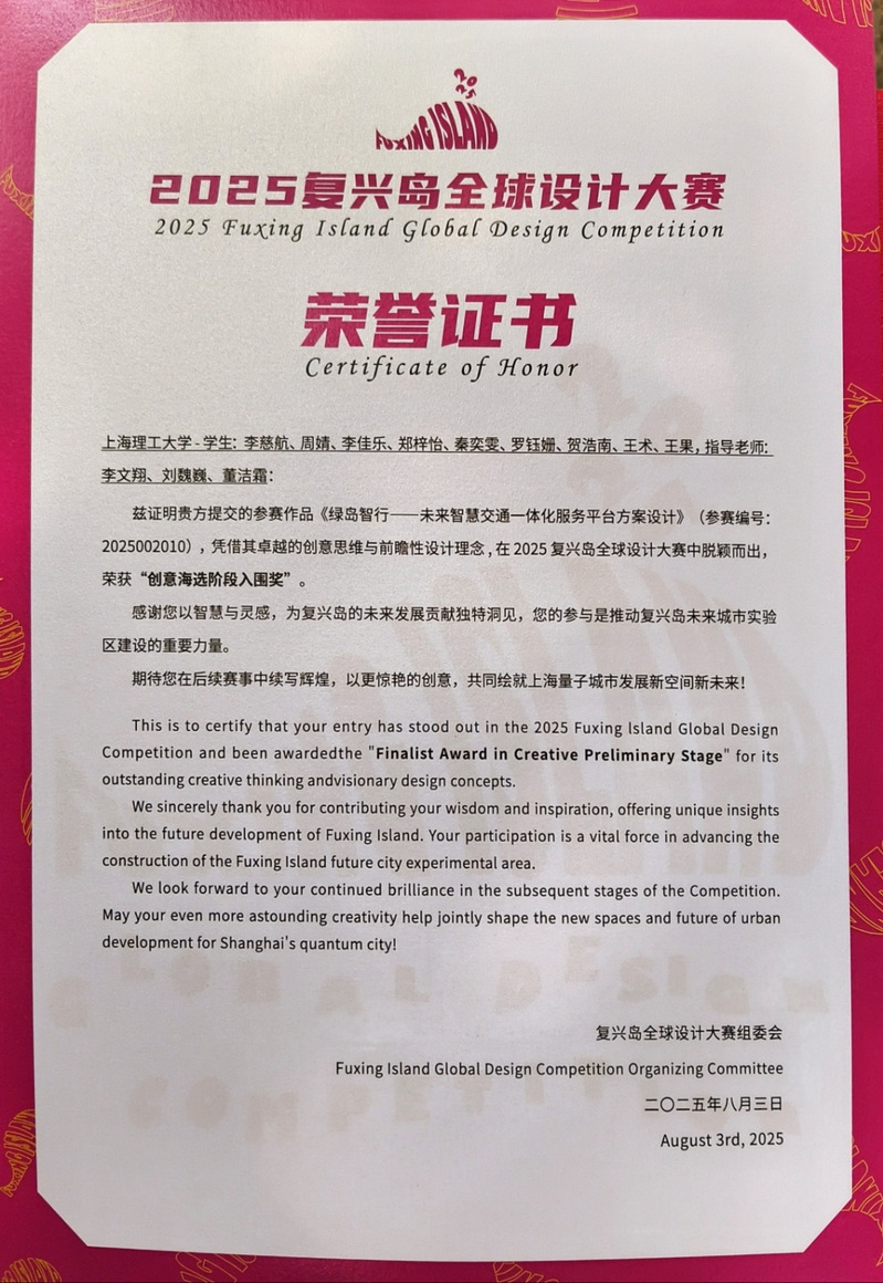 8月3日,上海理工大學(xué)管理學(xué)院收到復(fù)興島全球設(shè)計(jì)大賽組委會(huì)頒發(fā)的2025復(fù)興島全球設(shè)計(jì)大賽榮譽(yù)證書(shū)。由管理學(xué)院副院長(zhǎng)劉魏巍、交通系統(tǒng)工程系教師李文翔和董潔霜聯(lián)合指導(dǎo)的參賽作品《綠島智行——未來(lái)智慧交通一體化服務(wù)平臺(tái)方案設(shè)計(jì)》,經(jīng)過(guò)校內(nèi)選拔賽、大賽組委會(huì)評(píng)審等多個(gè)環(huán)節(jié),從全球600余份創(chuàng)新提案中脫穎而出,獲“創(chuàng)意海選階段入圍獎(jiǎng)”,成為僅有的40支晉級(jí)復(fù)賽團(tuán)隊(duì)之一。 獲獎(jiǎng)證書(shū)2025復(fù)興島全球設(shè)計(jì)大賽由上海市規(guī)劃和自然資源局、上海市楊浦區(qū)人民政府共同主辦,聚焦復(fù)興島“數(shù)字島、設(shè)計(jì)島、人民島”三島功能定位,面向全球規(guī)劃、建筑、景觀(guān)、藝術(shù)、數(shù)字智能、商業(yè)策劃、文化體育、旅游展覽等各領(lǐng)域的團(tuán)隊(duì)或個(gè)人,以