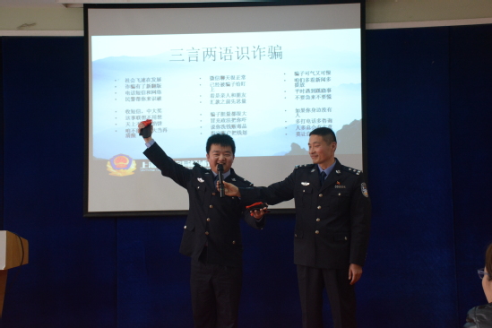 隨后,“網紅”黃超警官、魏海嶺警官通過相聲、快板、演說多形式揭露身邊常見的“套路”。例如將手機驗證碼轉發(fā)給他人導致個人錢款被盜,微信陌生人加好友套近乎從而導致個人信息泄露等。兩位警官通過詼諧的語言一一拆穿犯罪分子實施詐騙的慣用伎倆,生動有趣的表演帶動了現場氛圍,引發(fā)在場師生的深刻思考。隨后,魏海嶺警官通過案例與視頻教學向大家展示商圈扒竊的常見手法,就當下期間需重點關注的防火防盜防騙防事故等主題安全知識進行專業(yè)講解。他指出上下班高峰期、周末節(jié)假日、冬末初春是扒手作案的高峰時間段,而擁擠的公交車站、商場、飯店等是主要發(fā)生地點,呼吁大家在外出時要結伴而行,財物確保不離開視線。黃超警官圍繞防火安全、國家安全等主題展開分享。關于防火,黃警官通過現場實地教學,講解了滅火器的正確使用方法以及救火原則,糾正了大家平時使用滅火器的誤區(qū)。