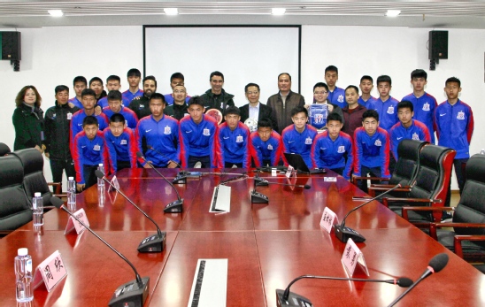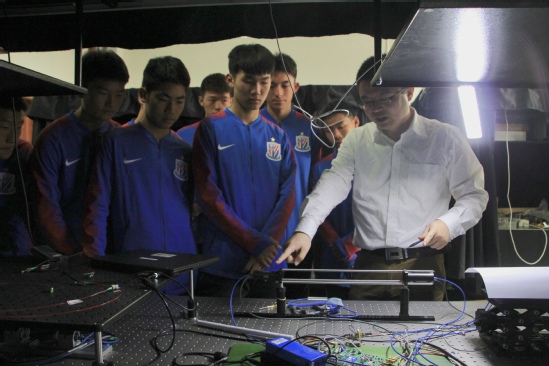 為了進一步提升上海綠地申花俱樂部青少年球員的文化素質(zhì),積極開拓知識面、有效地輔助促進競技訓(xùn)練,并進一步加強與先進單位的橫向聯(lián)合。3月22日上午,上海綠地申花足球俱樂部辦公室主任周欣、03梯隊助理教練安德烈·巴拉伊奇(Andrija Balajic)和守門員教練達比松·弗朗哥(Davison Franco)帶領(lǐng)俱樂部03梯隊全體成員赴我校光電信息與計算機工程學(xué)院進行參觀學(xué)習(xí)。光電學(xué)院院長莊松林院士、校工會副主席倪偉、體育教學(xué)部副主任袁勇等相關(guān)領(lǐng)導(dǎo)教師出席活動。