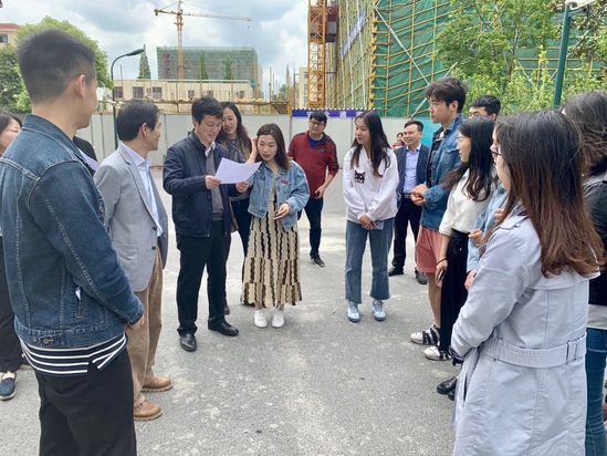 校領(lǐng)導(dǎo)向?qū)W生展示南校區(qū)新建一期工程中的食堂大樓