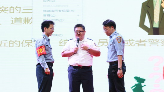 王永鎮(zhèn)為現(xiàn)場的師生講述了部分事故起因及情況,他以真實發(fā)生的安全事故為例,向同學(xué)們講解了相關(guān)的應(yīng)對方法。隨后,他與兩位上海民安的工作人員共同演示了產(chǎn)生沖突時進行化解處理的方法,提醒同學(xué)遇到?jīng)_突一定要保持冷靜,注意隔離等。王永鎮(zhèn)還隨機邀請了兩位同學(xué)為大家演示如何給陌生人指示路線,提醒同學(xué)們標(biāo)志的重要性。同時他也以膠州路大火事件為例講解逃生注意點等。