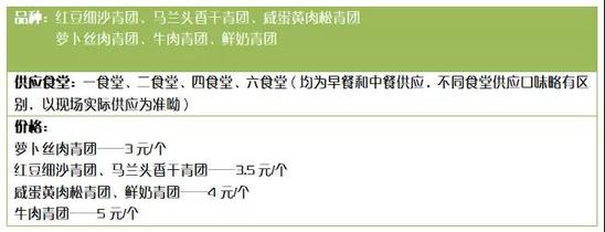 今年,上海理工大學(xué)在早餐和午餐時(shí)間段進(jìn)行青團(tuán)供應(yīng),除傳統(tǒng)紅豆細(xì)沙青團(tuán)、馬蘭頭香干青團(tuán)、咸蛋黃肉松青團(tuán)等口味,還創(chuàng)新推出蘿卜絲肉青團(tuán)、牛肉青團(tuán)、鮮奶青團(tuán)供廣大學(xué)子選擇購買,青團(tuán)單價(jià)根據(jù)口味不同為3元/個(gè)—5元/個(gè)。