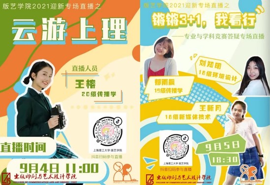 上海理工大學(xué)版藝學(xué)院舉辦線上迎新直播活動(dòng),采用老友圓桌談的形式,三位在高級(jí)別創(chuàng)新創(chuàng)業(yè)賽事中屢獲佳績(jī)的學(xué)姐通過《鏘鏘三加一 我看行》專業(yè)與學(xué)科競(jìng)賽答疑專場(chǎng)直播向新生答疑解惑,播下創(chuàng)新創(chuàng)業(yè)的種子。