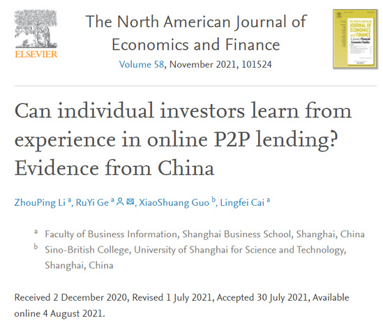 近日,中英國(guó)際學(xué)院教師郭曉爽以合作第二作者身份在國(guó)際知名期刊SSCI期刊《北美經(jīng)濟(jì)與金融學(xué)報(bào)》(The North American Journal of Economics and Finance)發(fā)表題為《個(gè)體投資者能夠從經(jīng)驗(yàn)中學(xué)習(xí)嗎?來自中國(guó)網(wǎng)貸的證據(jù)》(Can individual investors learn from experience in online P2P lending? Evidence from China)的研究論文。該論文利用中國(guó)網(wǎng)貸賬戶級(jí)數(shù)據(jù),研究了投資人初始能力與退出行為的關(guān)系,將學(xué)習(xí)行為分解為改善投資績(jī)效與了解自身能力兩種模式,并深入分析了這兩種學(xué)習(xí)模式與投資人經(jīng)驗(yàn)之間的關(guān)系。