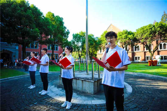 “石庫(kù)門的燈光照亮了信仰的道路,南湖的航船扯起了遠(yuǎn)航的風(fēng)帆。優(yōu)秀兒女在黨旗下莊嚴(yán)宣誓,在神州大地上播撒下革命的火種?!?938年,滬江大學(xué)校長(zhǎng)、年僅43歲的教育大家劉湛恩以身殉國(guó)。在上海理工大學(xué)劉湛恩烈士故居紅色文化主題館外,師生們以一首《我們不會(huì)忘記》致敬先烈,重溫紅色記憶。今天一早,師生們也在學(xué)校國(guó)慶廣場(chǎng)舉行了升期儀式。