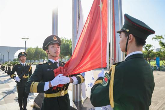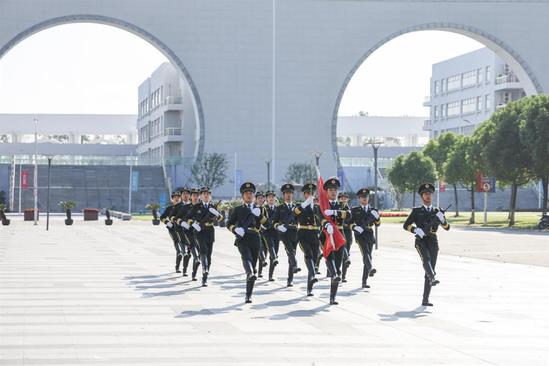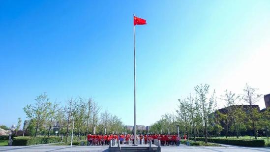 同天早上8時(shí),上海對(duì)外經(jīng)貿(mào)大學(xué)校園里響起了嘹亮的國(guó)歌聲。在松江校區(qū)信息樓南廣場(chǎng)上,在國(guó)旗護(hù)衛(wèi)隊(duì)的守護(hù)下,五星紅旗冉冉升起。參加升旗儀式的全體師生肅立,向祖國(guó)致敬?!拔覑勰?,中國(guó)!”