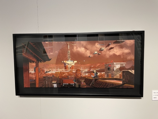“中華·天梯”描繪了22世紀(jì)中國(guó)在類似火星的衛(wèi)星上建設(shè)的太空電梯及周邊太空城市場(chǎng)景?!白髌氛宫F(xiàn)的是中國(guó)在一個(gè)類似火星的衛(wèi)星上建立了自己的基地,前景中的古建筑表達(dá)的是中國(guó)人的鄉(xiāng)土情懷,可以稱之為‘中華風(fēng)情區(qū)’。近處的傳統(tǒng)建筑與遠(yuǎn)處的燈光閃爍的軌道電梯、城市、飛車形成對(duì)比,這就像是全球各地的華人街,不論在哪你都能感受到中國(guó)文化,希望通過(guò)這幅作品去表達(dá)自己對(duì)于未來(lái)中國(guó)在太空領(lǐng)域的發(fā)展以及對(duì)中國(guó)航天技術(shù)發(fā)展的想象,表達(dá)我對(duì)中華文化的信心。”趙力表示。