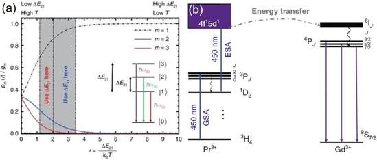 當(dāng)代納米醫(yī)療、光電子器件的小型化和高度集成化、精細(xì)化工等發(fā)展要求下,極寬溫度、高度敏感、穩(wěn)定、可重復(fù)性非接觸無損微納米尺寸范疇的溫度測量是一個亟待研究的課題,有著極其重大的應(yīng)用價值。基于鑭系離子4f n能級發(fā)光比率測溫技術(shù)是一種新興的非接觸無損測溫技術(shù),具有高的時空分辨率,其設(shè)計及應(yīng)用通常是基于玻爾茲曼定律所控制的具有一定能帶隙的兩個能級間的熱耦合,如經(jīng)典的Er3+離子2H11/2-4S3/2能級間隔約為750-800cm-1。事實上,較低的環(huán)境溫度使兩個激發(fā)態(tài)能級間的熱平衡難以實現(xiàn),較高的溫度雖有利于兩個激發(fā)態(tài)的熱平衡,但只能獲得較低的相對測溫靈敏度。基于雙激發(fā)態(tài)能級相關(guān)的玻爾茲曼型溫度計只可在一個有限的溫度范圍內(nèi)實現(xiàn)較精確的溫度測量(取決于能級間隔寬度大?。?/p>