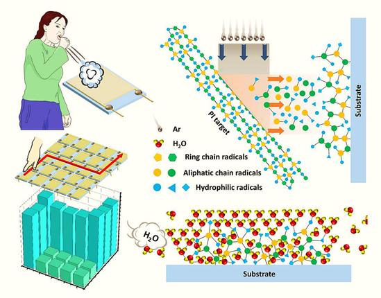 超高靈敏濕度傳感器可用于生命體征檢測或非接觸感應(yīng),在人工智能、生物醫(yī)學(xué)領(lǐng)域具有巨大的應(yīng)用潛力。團(tuán)隊創(chuàng)新性地提出一種對聚合物靶材進(jìn)行離子束濺射沉積,制備聚合物濕敏薄膜的通用方法,成功以聚酰亞胺為濺射靶材制備了高靈敏濕敏薄膜,并系統(tǒng)研究了其成膜機制和傳感機理。新型傳感器在10-95%的相對濕度范圍內(nèi)具有超高靈敏(電容值變化超過40000倍),快速響應(yīng)(~1s),遲滯小和穩(wěn)定工作時間長等優(yōu)異特性,實現(xiàn)了非接觸感應(yīng),并對人體呼吸的深淺程度和頻率等信息進(jìn)行實時監(jiān)測,同時也可以檢測植物葉片氣孔的開閉狀態(tài)。研究還制備了5×5規(guī)格的新型傳感器陣列,成功記錄被試者手指懸空劃過的軌跡并可以較準(zhǔn)確的反映出潮濕物體的形狀。該研究成果提供了制備濕度傳感器的新思路,新型聚合物濕度傳感器有望應(yīng)用于生物體呼吸監(jiān)測和無接觸感應(yīng)等領(lǐng)域。