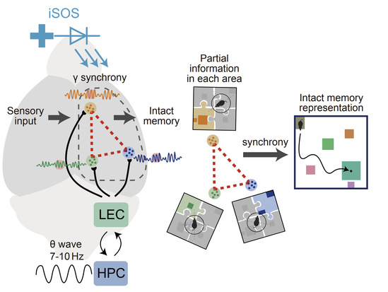 圖2. 海馬HPC-外側(cè)內(nèi)嗅皮層LEC通過伽馬同步(γ synchrony)幫助皮層記憶形成與提取。插圖顯示海馬θ波、皮層的長程γ同步活動和皮層印跡細胞的活動,三者耦合進行信息編碼存儲。記憶編碼的每個皮層區(qū)域的部分信息通過海馬θ波調(diào)制的皮層γ同步活動進行整合,從而形成完整的記憶表征。